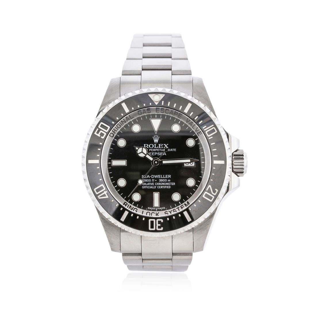 One gents, hand crafted & machine milled Rolex Stainless Steel Deep Sea-Dweller DeepSea model wristwatch electronically tested, Case: 44mm oyster, Case Back: engraved with the manufacturers name, logo, model name, and additional information, Water Resistant: 3900 meters / 12800 feet, with a Helium release valve for extreme depth diving, Crown: twin lock with logo, set within protective shoulders, Bezel: uni directional with Black disc, time lapse sixty minute timer, Crystal: synthetic sapphire lens. Case Ring Lock system: the watch can withstand 2.98 metric tonnes of water pressure. Movement: superlative chronometer, Power Reserve: 47 hours, Dial: Black, with luminous hands and indices, Date Window: 3 o'clock position, quick set, Bracelet: stainless steel, Oyster, Glidelock clasp with diver's extension, Condition: G-7 Near Mint. Eight and one half inch length, adjustable. Total Weight of Watch 209.30 grams. Includes box and papers. AIG Appraised at $12,050.00.