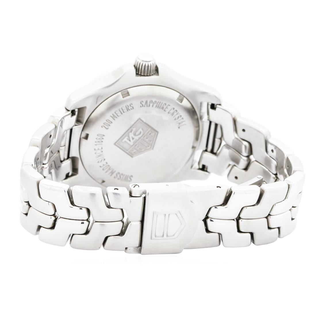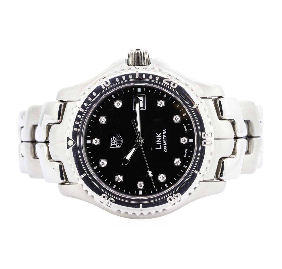 One Men's Tag Heuer round case Link wrist watch stainless steel, Crown: screw-down, Bezel: uni-rotational, Crystal: sapphire, Movement: quartz, Dial: black date display 3 o'clock with baton, pointed type hands and diamond marker numerals, Bracelet: matching with bright and satin finish, Condition: G-6 extra fine. Containing: Eleven prong set round brilliant cut diamonds, measuring 1.80 - 1.75 x 1.07mm (depth est.) approximate total weight of 11 Stones = 0.22ct. Graded in the setting. Color F - G Clarity VS-1 to VS-2 Cut Very Good. Total Weight of Diamonds 0.22ct. Total Weight of Watch 162.00gm. GAS Appraised.