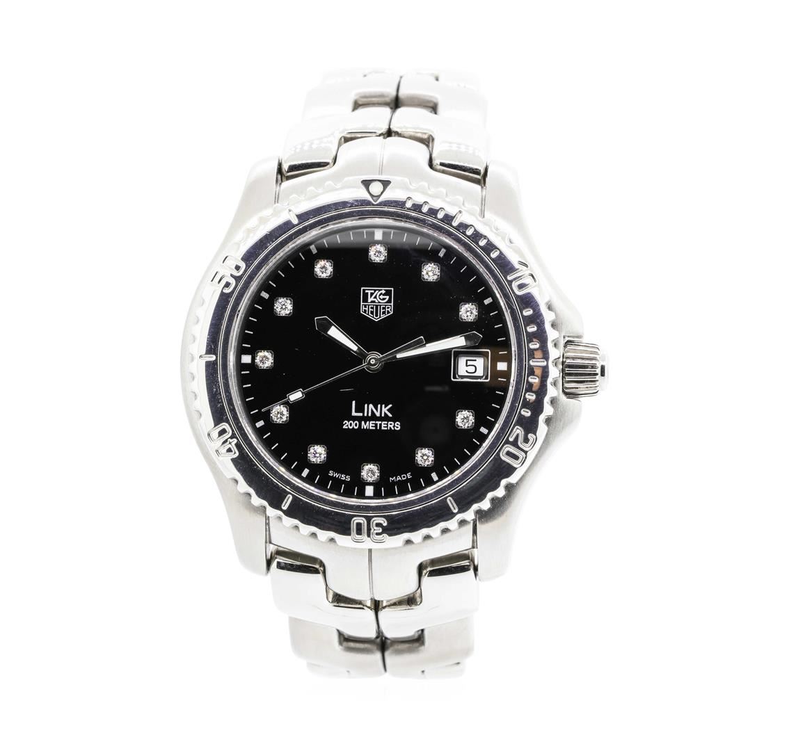 One Men's Tag Heuer round case Link wrist watch stainless steel, Crown: screw-down, Bezel: uni-rotational, Crystal: sapphire, Movement: quartz, Dial: black date display 3 o'clock with baton, pointed type hands and diamond marker numerals, Bracelet: matching with bright and satin finish, Condition: G-6 extra fine. Containing: Eleven prong set round brilliant cut diamonds, measuring 1.80 - 1.75 x 1.07mm (depth est.) approximate total weight of 11 Stones = 0.22ct. Graded in the setting. Color F - G Clarity VS-1 to VS-2 Cut Very Good. Total Weight of Diamonds 0.22ct. Total Weight of Watch 162.00gm. GAS Appraised.