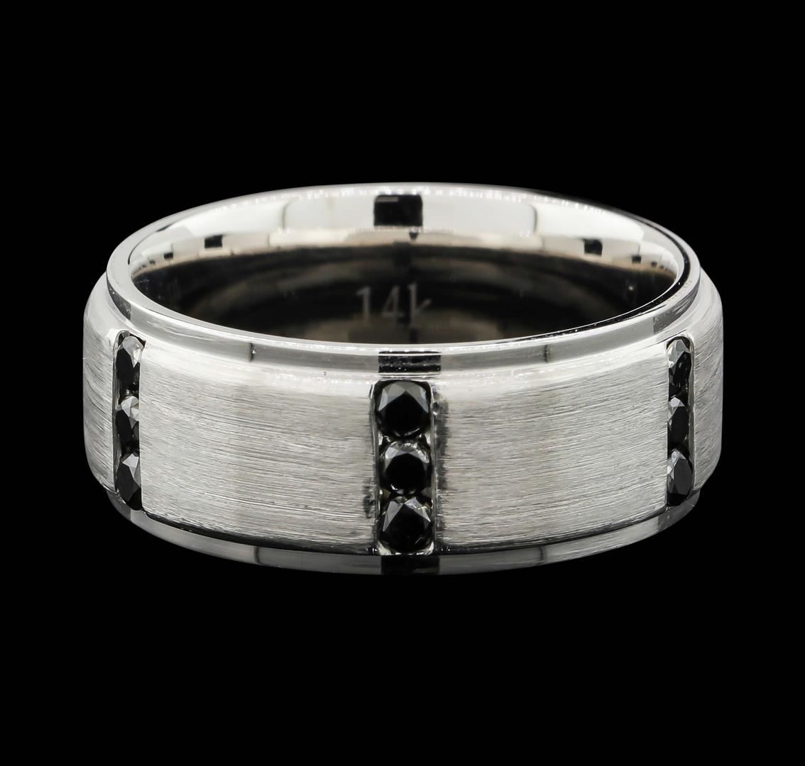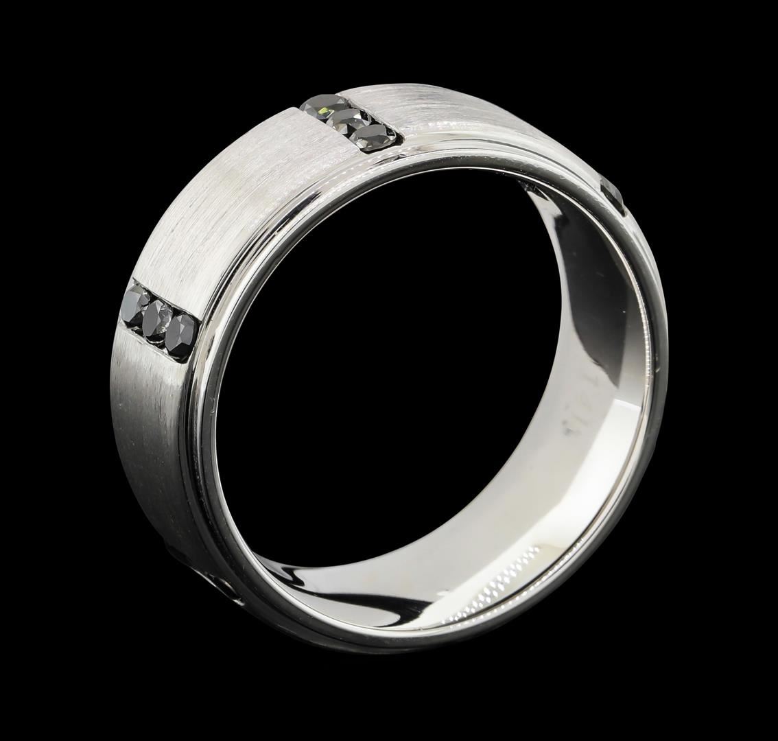 One Mens 14K Brushed White Gold 0.90ctw Black Diamond Wedding Ring weighing approximately 13.7 grams. The inside of the band is stamped with "14K", there are (18) Round Cut Black Diamonds with an approximate total weight of 0.90ctw. Ring size is 10.