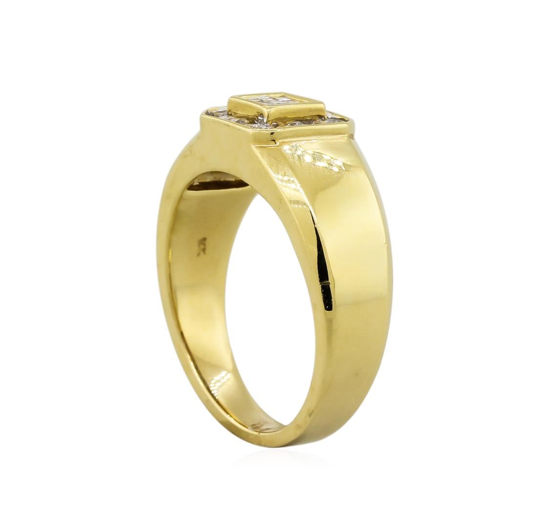 One electronically tested 14KT yellow gold cast diamond ring with a bright polish finish. The ring features a central gallery of princess cut diamonds set within a diamond bezel supported by tapering shoulders, completed by a three millimeter wide band. Identified with markings of "14K". Condition is good. Containing: Nine channel set princess cut diamonds, measuring 1.50 x 1.50 x 1.15mm (depth est.) approximate. Total Weight of 9 Stones = 0.20ct. Graded in the setting. Clarity: VS-2 to SI-2. Color: G - I Sixteen channel set round brilliant cut diamonds, measuring 1.70 - 1.70 x 1.20mm (depth est.) approximate. Total Weight of 16 Stones = 0.30ct. Graded in the setting. Clarity: SI-2 to I-1. Color: G - I. Total Weight of Diamonds 0.50ct. Total Weight of Ring 11.40gm. AIG Appraised at $2,985.00.