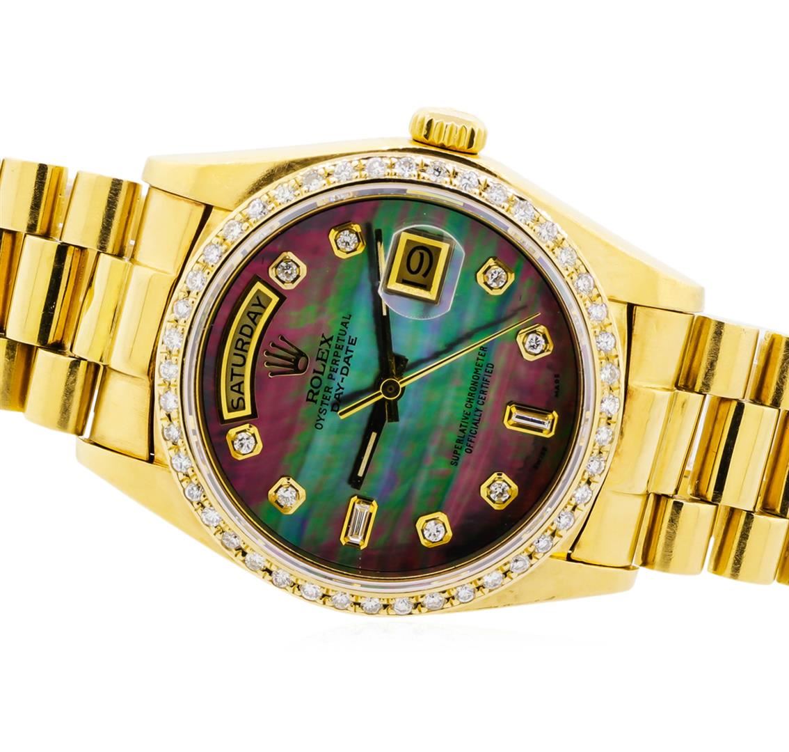 One gents, Rolex DayDate Model the President wristwatch electronically tested 18KT yellow gold, Swiss Hallmarked Case: 36mm oyster, Crown: twin lock with logo, non-factory Custom Bezel: diamond set, non-factory Custom Crystal: synthetic sapphire cyclops lens. Circa: 1979.Movement: superlative chronometer, Customized Rolex signed Dial: dark Mother of Pearl, with baton hands, & diamond markers, Calendar: single-quick set, Rolex President Bracelet: 18KT yellow gold, bright polish and satin finish, Condition: G-5 Fine. Seven and one half inch length. Swiss Hallmarked Rolex concealed deployment clasp, with logo Containing: Forty-four prong set round brilliant cut diamonds, measuring 1.70 - 1.50 x 0.96mm (depth est.) approximate total weight of 44 Stones = 0.70ct. Set & graded in the custom bezel. Clarity: VS-2 to SI-1 Average. Color: F - H. Total Weight of Diamonds 0.70ct. Total Weight of Watch 134.01gm. This watch also comes with Appraisal and Box. AIG Appraised at $22,550.00.