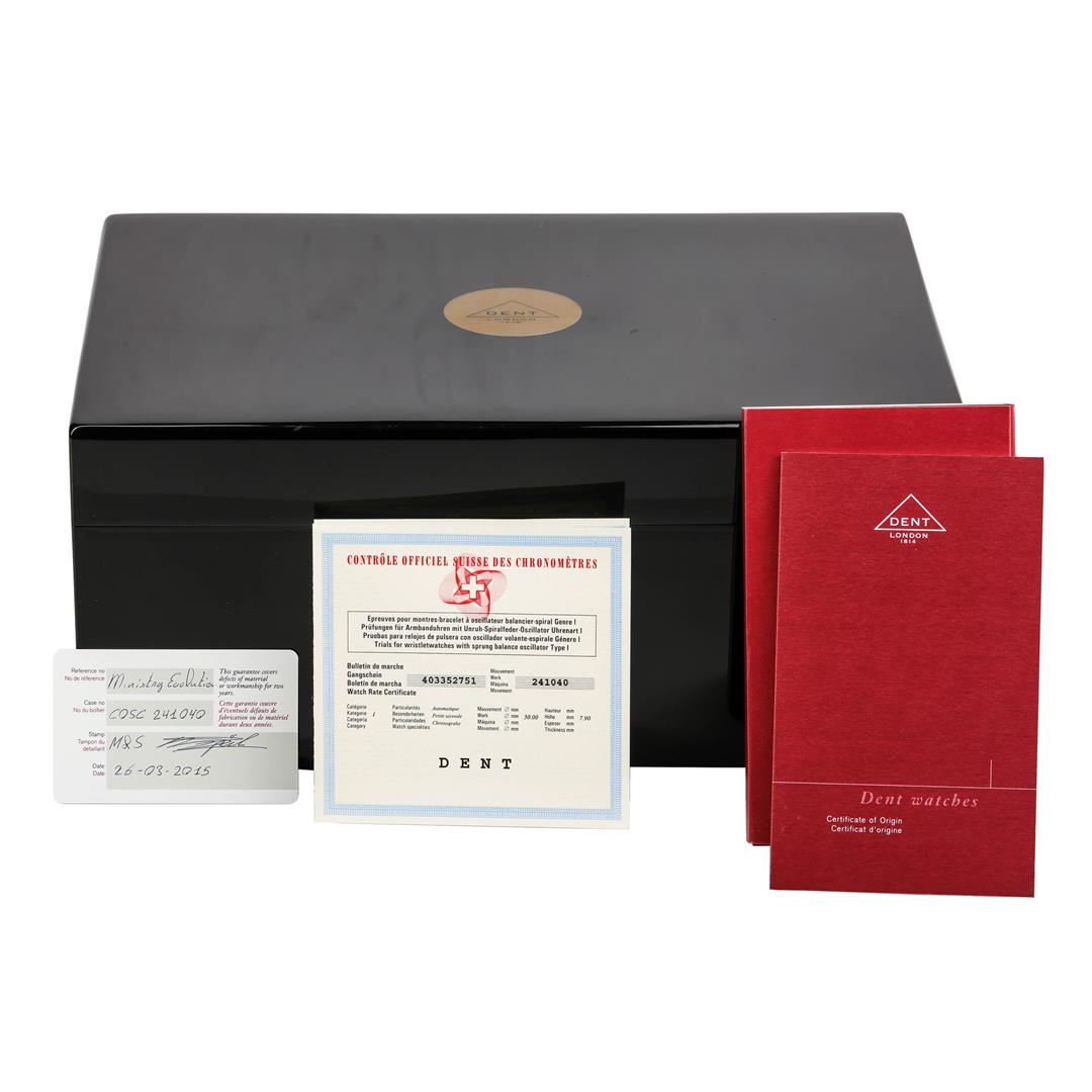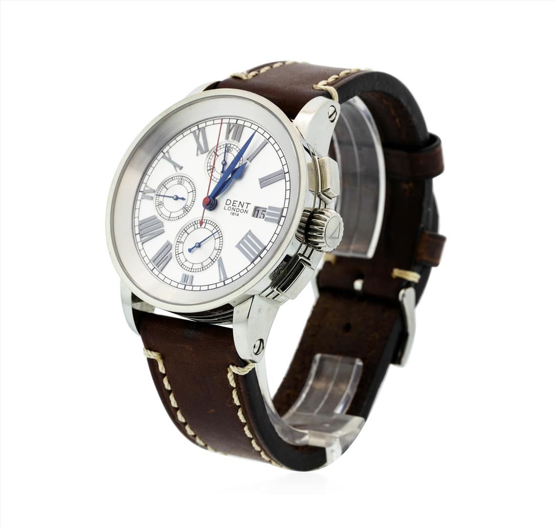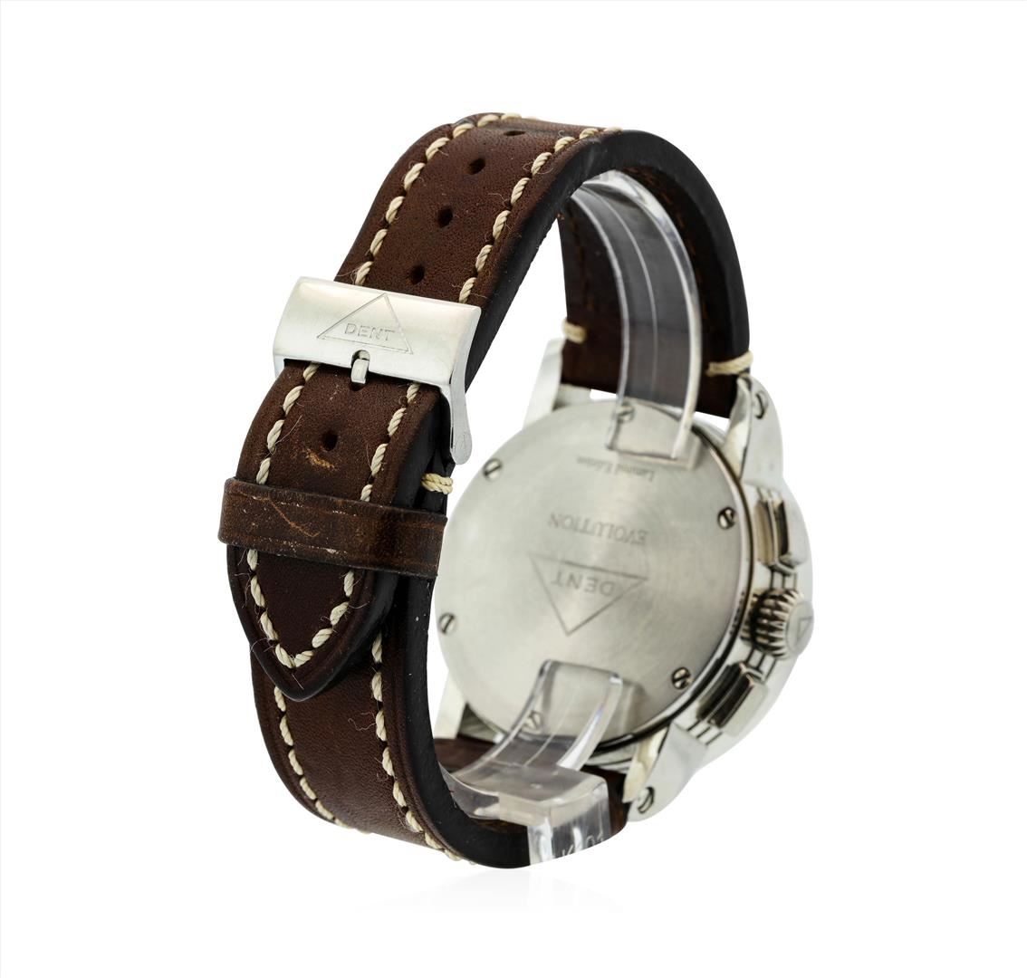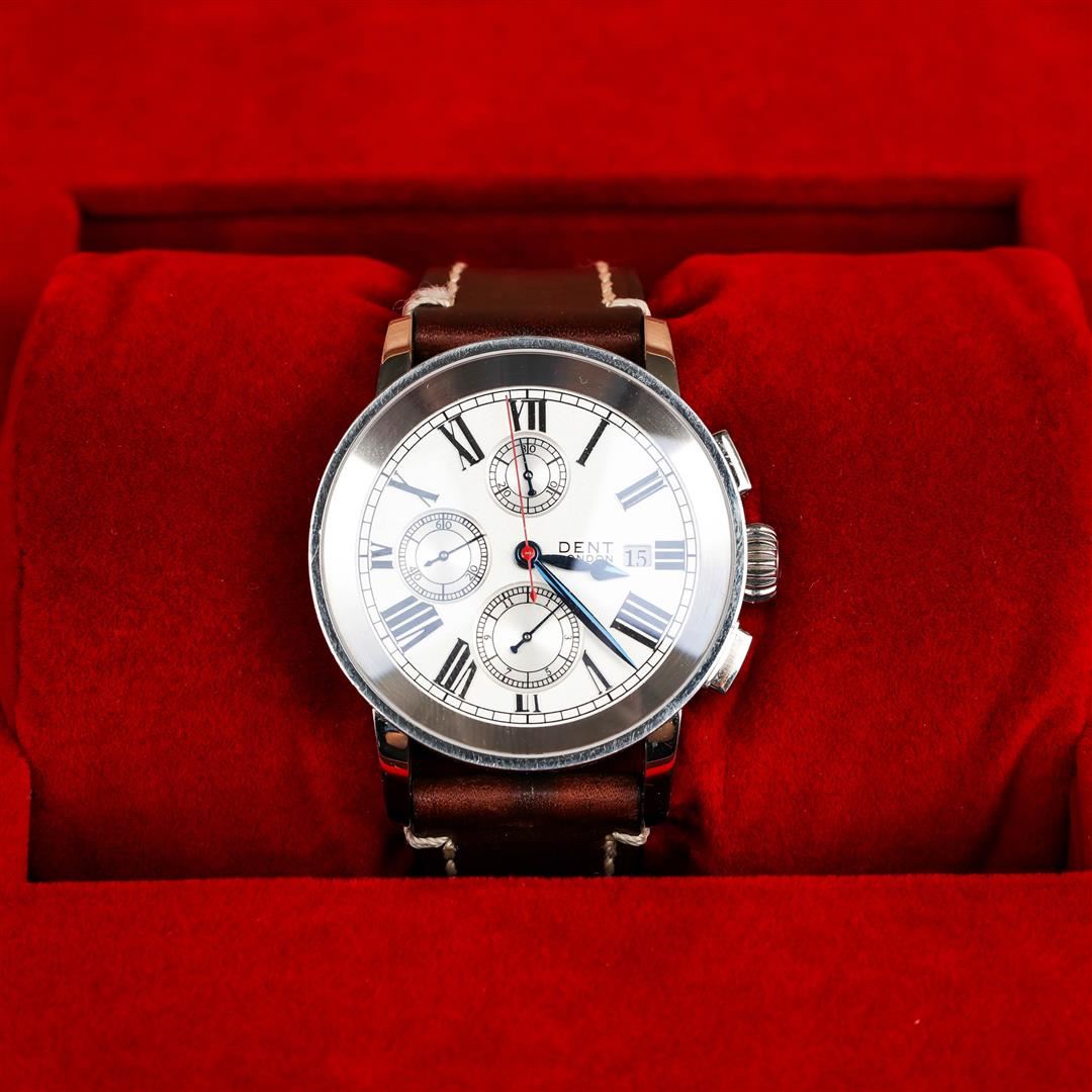 One Men's Dent Ministry Evolution Stainless Steel Chronograph Automatic Watch. This watch is powered by a Dent caliber 301 automatic chronograph. The watch contains the following attributes: Dial: Silver Dial with Roman Numeral Markers, hour, minute, seconds, 30 minute & 12 hour recorder and date, Bracelet: Custom Brown Leather Band with High Grade Stainless Steel buckle. This Dent Ministry Evolution watch had a limited production of 250 pieces' worldwide so you would be lucky to find one, let alone own one in this condition. The watch comes complete with original Box, warranty card and booklets.