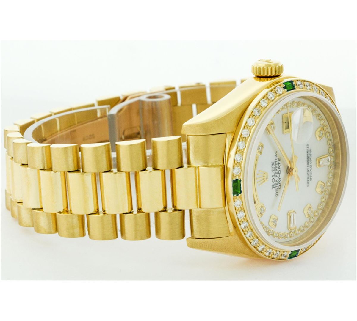 One Mens Rolex Day Date President Polished, Serviced & Electronically Tested, Yellow Gold Case:36mm, Yellow Gold Crown, Custom Bezel: 18K Yellow Gold Emerald Beadset Diamond Bezel, Diamond + Gem Count: 36 Diamonds + 4 Emeralds Total Weight 1.00 Carat, Clarity: SI-VS, Color: G to H. Custom Crystal: Synthetic Sapphire Cyclops Lens. Movement: Automatic Winding Movement Caliber 3055. Custom Dial: Mother Of Pearl String Diamond Dial With 2 Baguettes, (49 Diamond In Dial + 2 Baguette Diamonds In Dial) G To H In Color, Clarity: SI-VS. Date Window: 3 O'Clock Position Date Display, Day Window: 12 O'Clock Position Date Display. Quickset, Model: 18038 Condition: G-6 Extra Fine. Bracelet: Yellow Gold President. Bright Polish. 6.5 Inch Length, Standard Hidden President Clasp President Band, With Rolex Logo.
