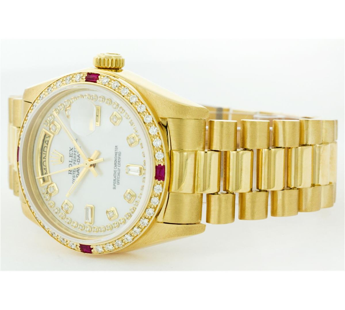 One Mens Rolex President Polished, Serviced & Electronically Tested, Yellow Gold Case:36mm, Yellow Gold Crown, Custom aftermarket Bezel: 18K Yellow Gold Ruby Beadset Diamond Bezel, Diamond + Gem Count: 36 Diamonds + 4 Rubies, Total Weight 1.00 Carat, Clarity: SI-VS, Color: G to H. Custom aftermarket Crystal: Synthetic Sapphire Cyclops Lens. Movement: Automatic Winding Movement Caliber 3055. Custom aftermarket Dial: Mother Of Pearl String Diamond Dial With 2 Baguettes, (49 Diamond In Dial + 2 Baguette Diamonds In Dial) G To H In Color, Clarity: SI-VS. Date Window: 3 O'Clock Position Date Display, Day Window: 12 O'Clock Position Date Display. Quickset, Model: 18038 Condition: G-6 Extra Fine. Bracelet: Yellow Gold President. Bright Polish. 6.5 Inch Length, Standard Hidden Clasp President Clasp, With Rolex Logo.