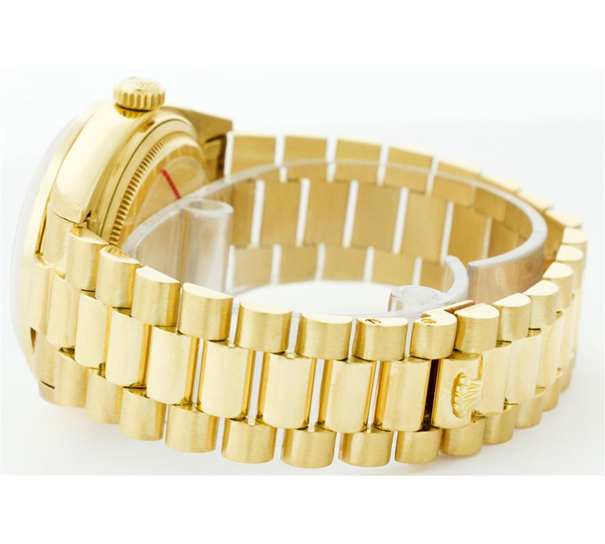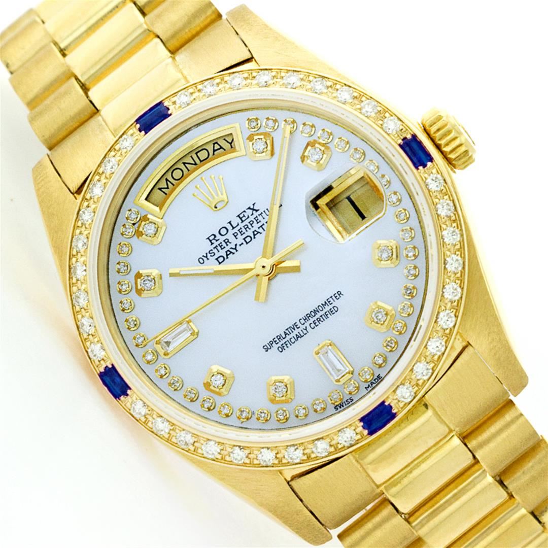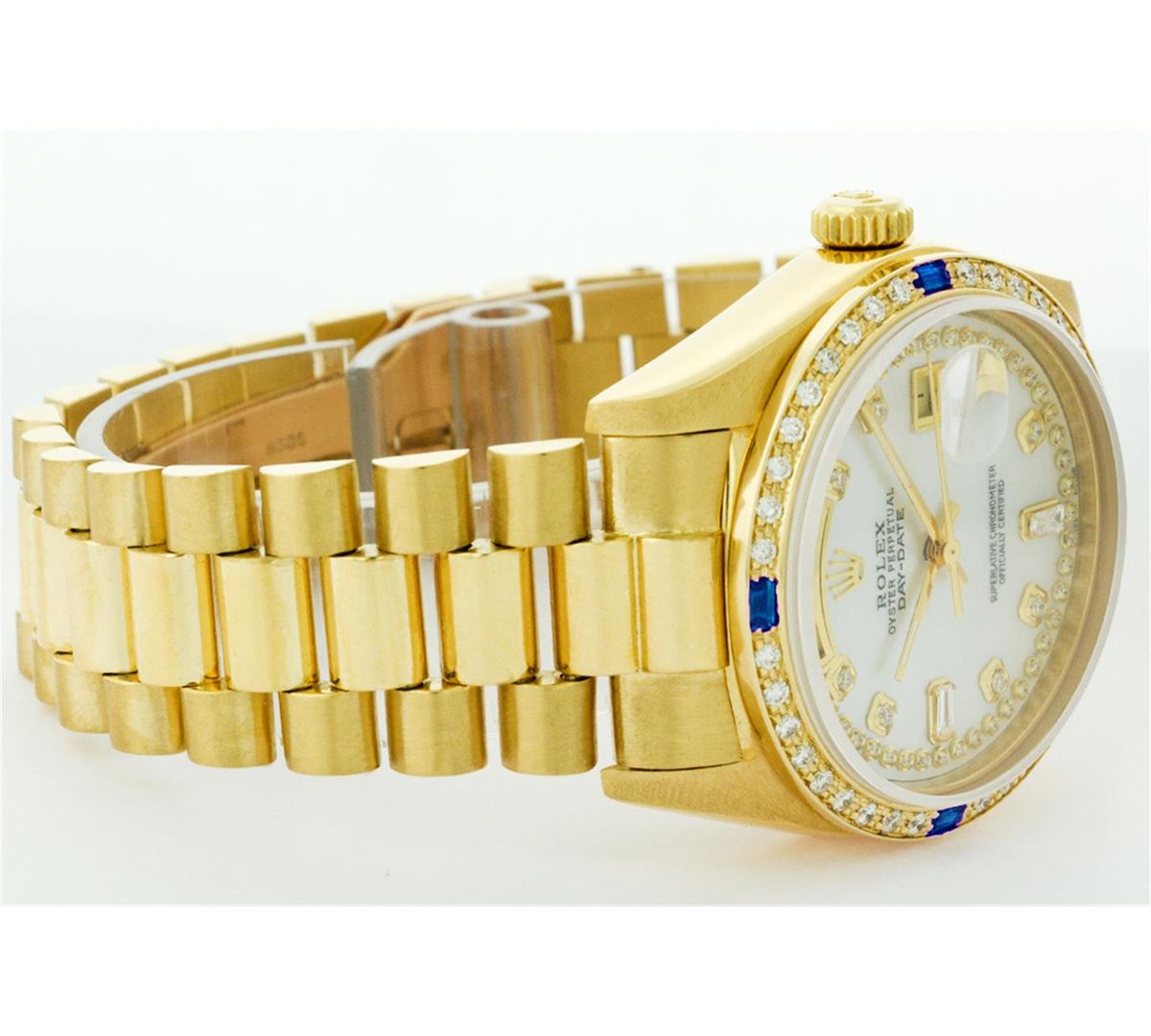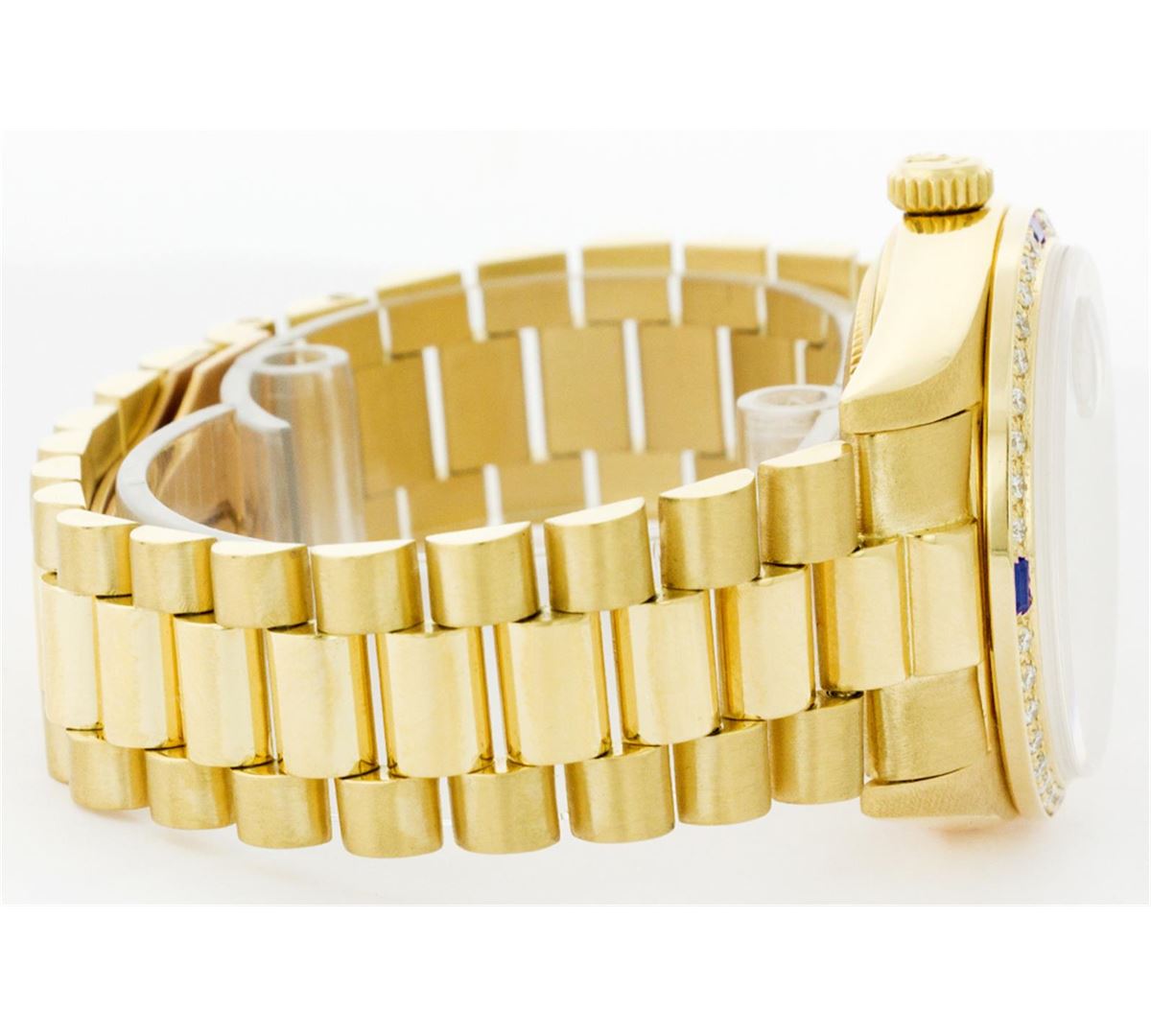 One Mens Rolex Day Date President Polished, Serviced & Electronically Tested, Yellow Gold Case:36mm, Yellow Gold Crown, Custom Bezel: 18K Yellow Gold Sapphire Beadset Diamond Bezel, Diamond + Gem Count: 36 Diamonds + 4 Sapphires, Total Weight 1.00 Carat, Clarity: SI-VS, Color: G to H. Custom Crystal: Synthetic Sapphire Cyclops Lens. Movement: Automatic Winding Movement Caliber 3055. Custom Dial: Mother Of Pearl String Diamond Dial With 2 Baguettes, (49 Diamond In Dial + 2 Baguette Diamonds In Dial) G To H In Color, Clarity: SI-VS. Date Window: 3 O'Clock Position Date Display, Day Window: 12 O'Clock Position Date Display. Quickset, Model: 18038 Condition: G-6 Extra Fine. Bracelet: Yellow Gold President. Bright Polish. 6.5 Inch Length, Standard Hidden Clasp President Clasp, With Rolex Logo.
