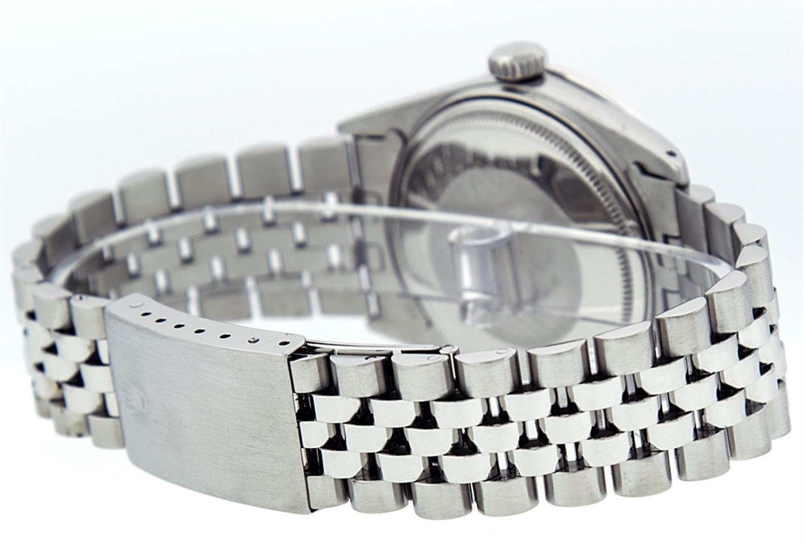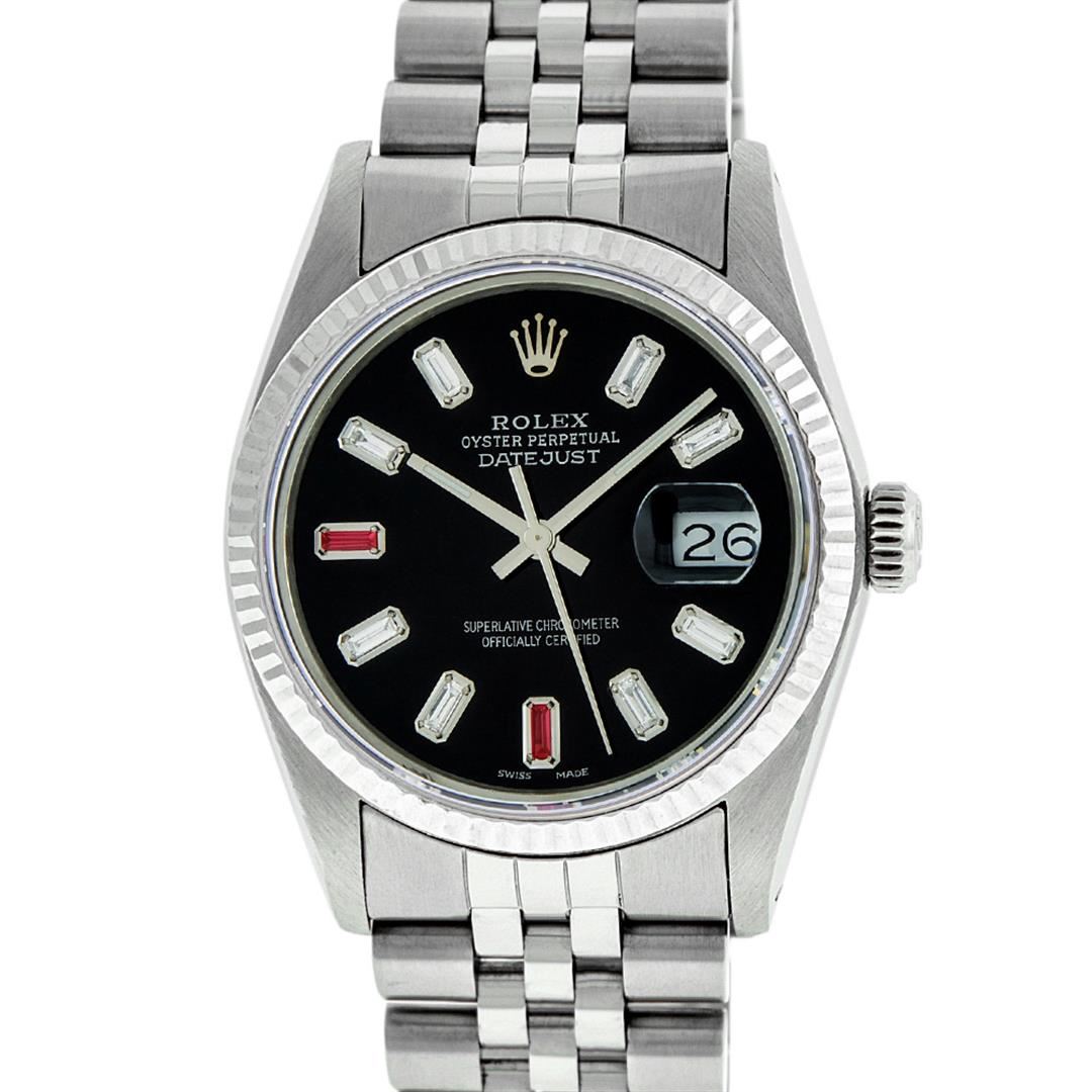 One Gents Rolex Datejust Polished Bright with Satin Finish, Serviced & Electronically Tested, Stainless Steel Case:36mm, Stainless Steel Crown, Bezel: 14K White Gold Fluted Bezel. Custom Crystal: Acrylic Cyclops Lens. Movement: Automatic Winding Movement Caliber 3035. Custom Dial: Black Baguette Diamond 8 + 2 Ruby, Stone Count: 8 Baguette Diamonds in Dial + 2 Ruby Baguettes G To H In Color, Si-VS Clarity. Date Window: 3 O'Clock Position Date Display, Quickset, Model: Datejust, Condition: G-6 Extra Fine. Bracelet:Stainless Steel Jubilee. Bright Polish & Satin Finish. 7.0 Inch Length, Adjustable. Standard Clasp, With Rolex Logo. Watch Has Been Serviced and Polished It Is Free Of All Scratches and Dents.