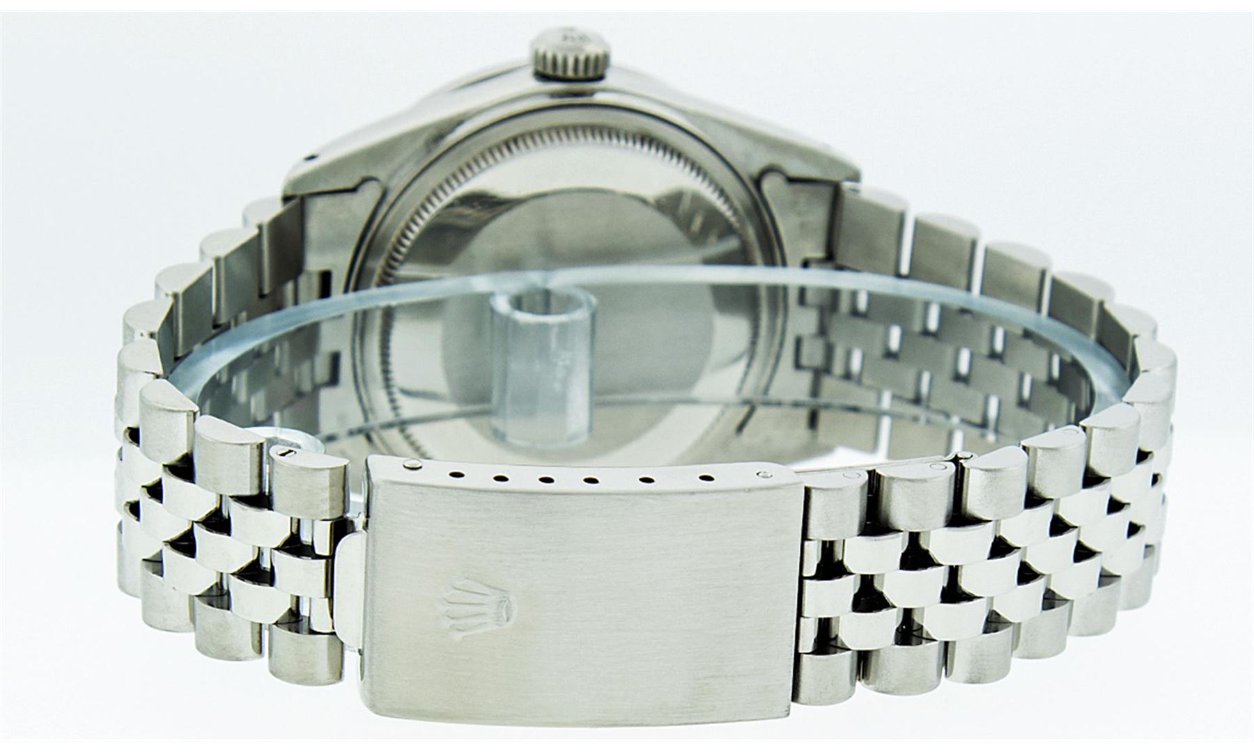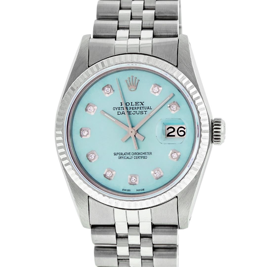 One Gents Rolex Datejust Polished Bright with Satin Finish, Serviced & Electronically Tested, Stainless Steel Case:36mm, Stainless Steel Crown, Original Bezel: 14K White Gold Fluted Bezel. Custom Crystal: Acrylic Cyclops Lens. Movement: Automatic Winding Movement Caliber 3035. Custom Dial: Ice Blue Diamond Dial, Diamond Count: 10 Diamond in Dial G To H In Color, Si-VS Clarity. Date Window: 3 O'Clock Position Date Display, Quickset, Model: Datejust, Condition: G-6 Extra Fine. Bracelet:Stainless Steel Jubilee. Bright Polish & Satin Finish. 7.0 Inch Length, Adjustable. Standard Clasp, With Rolex Logo.