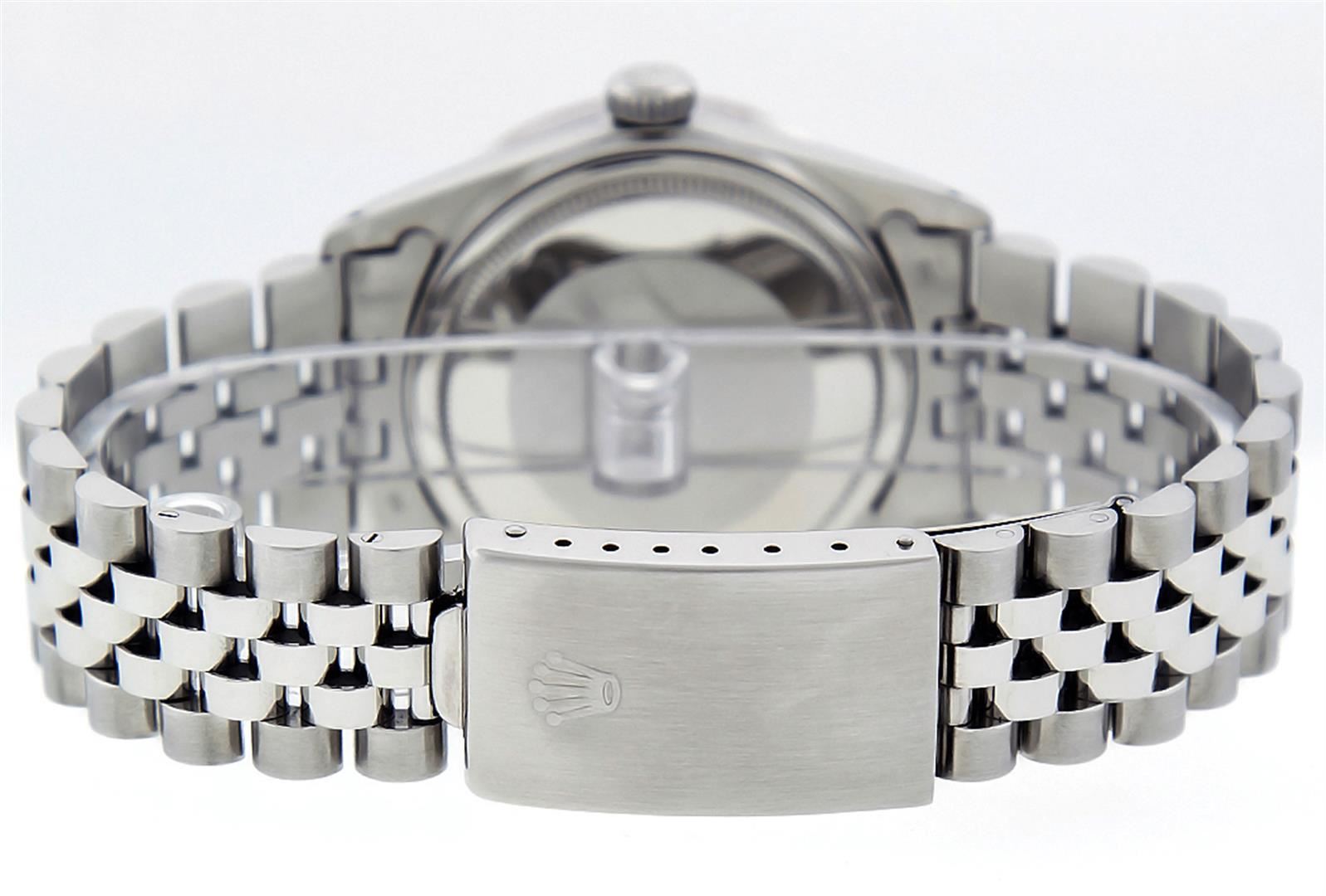 One Gents Rolex Datejust Polished Bright with Satin Finish, Serviced & Electronically Tested, Stainless Steel Case:36mm, Stainless Steel Crown, Bezel: 14K White Gold Fluted Bezel. Custom Crystal: Acrylic Cyclops Lens. Movement: Automatic Winding Movement Caliber 3035. Custom Dial: Ice Pink Diamond Dial, Diamond Count: 10 Diamond in Dial G To H In Color, Si-VS Clarity. Date Window: 3 O'Clock Position Date Display, Quickset, Model: Datejust, Condition: G-6 Extra Fine. Bracelet:Stainless Steel Jubilee. Bright Polish & Satin Finish. 7.0 Inch Length, Adjustable. Standard Clasp, With Rolex Logo.