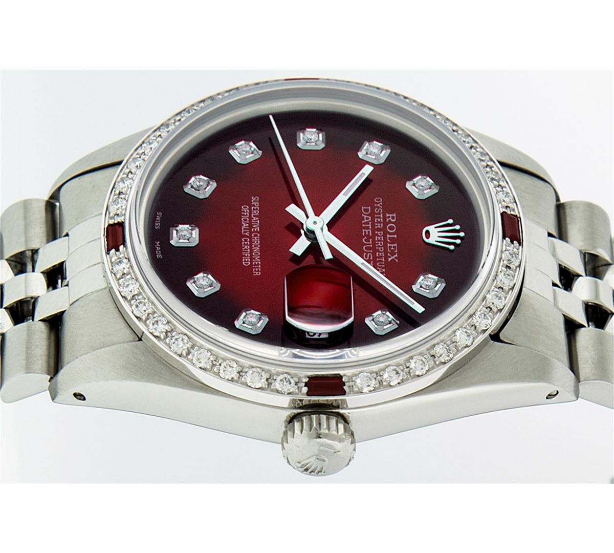 One Mens Rolex Datejust Polished, Serviced & Electronically Tested, Stainless Steel Case:36mm, Stainless Steel Crown, Custom Bezel: 18K White Gold Ruby Beadset Diamond Bezel, Diamond + Gem Count: 36 Diamonds + 4 Rubies Total Weight 1.00 Carat, Clarity: SI-VS, Color: G to H. Custom Crystal: Synthetic Sapphire Cyclops Lens. Movement: Automatic Winding Movement Caliber 3035. Custom Dial: Red Vignette With Diamond Hour Markers, 10 Diamond Dial G To H In Color, Clarity: SI-VS. Date Window: 3 O'Clock Position Date Display, Quickset, Model: Datejust. Condition: G-6 Extra Fine. Bracelet: Stainless Steel Jubilee. Bright Polish & Satin Finish. 7.0 Inch Length, Adjustable. Standard Clasp, With Rolex Logo