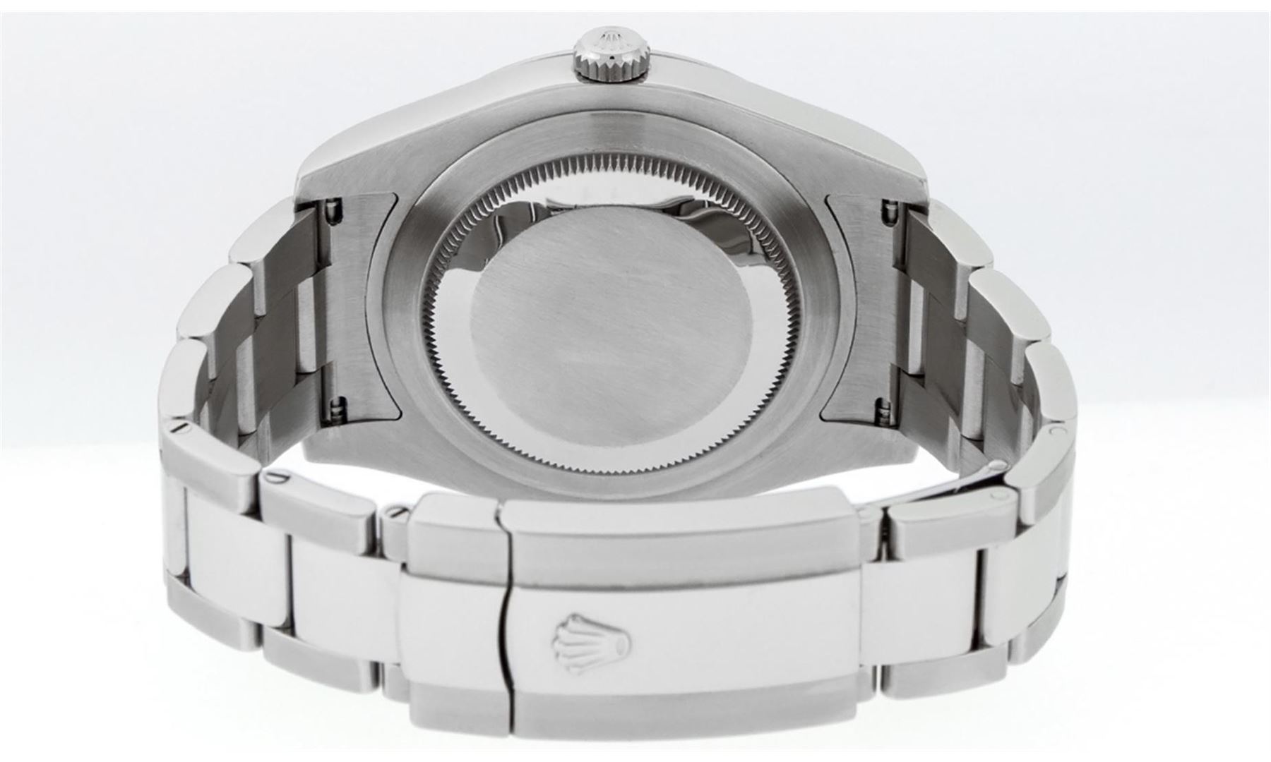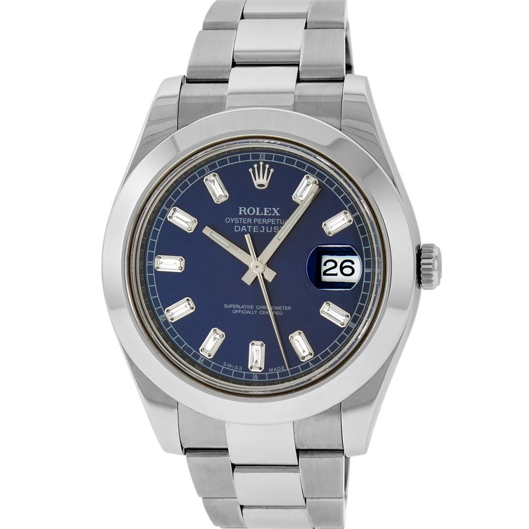 One Mens Rolex Datejust 2 High Polished, Serviced & Electronically Tested, Stainless Steel Case:41mm, Stainless Steel Crown, Bezel: Stainless Steel Smooth Bezel, Crystal: Synthetic Sapphire Cyclops Lens. Movement: Automatic Winding Movement Caliber 3136. Custom Dial: Blue Baguette Diamond Dial, Diamond Count:10 Diamond Baguettes In Dial, Diamond Color: G To H, Clarity: SI-VS. Date Window: 3 O'Clock Position, Date Display, Quickset, Model: 116300 Datejust 2. Condition: G-6 Extra Fine The Watch Is In Very Good Condition Free Of All Scratches and Dents. Bracelet:Stainless Steel Oyster Band. Bright Polish & Satin Finish. 7.5 Inch Length, Adjustable. Standard Clasp, With Rolex Logo.