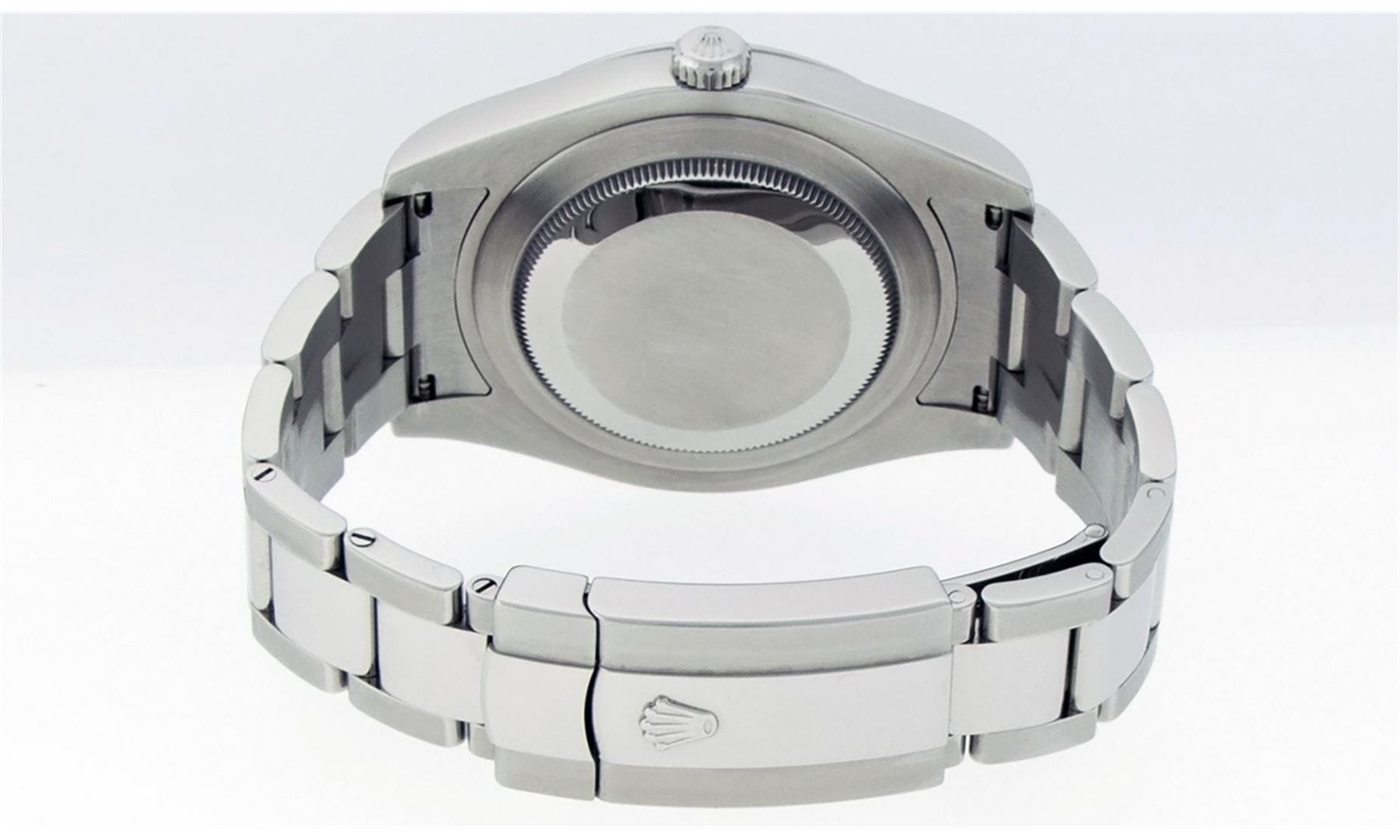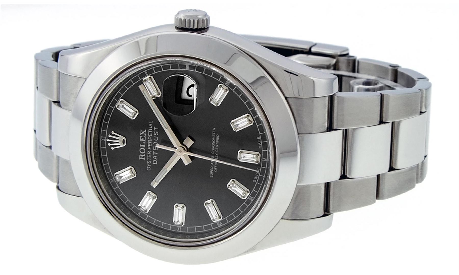 One Mens Rolex Datejust 2 Polished With High Polish, Serviced & Electronically Tested, Stainless Steel Case:41mm, Stainless Steel Crown, Bezel: Stainless Steel Smooth Bezel, . Crystal: Synthetic Sapphire Cyclops Lens. Movement: Automatic Winding Movement Caliber 3136. Custom Dial: Dark Rhodium Baguette Diamond Dial, Diamond Count: 10 Diamond Baguettes In Dial, Diamond Color: G To H, Clarity: SI-VS. Date Window: 3 O'Clock Position Date Display, Quickset, Model: 116300 Datejust 2. Condition: G-6 Extra Fine The Watch Is In Very Good Condition Free Of All Scratches and Dents. Bracelet:Stainless Steel Oyster Band. Bright Polish & Satin Finish. 7.5 Inch Length, Adjustable. Standard Clasp, With Rolex Logo. Watch Has Been Serviced and Polished It Is Free Of All Scratches and Dents.