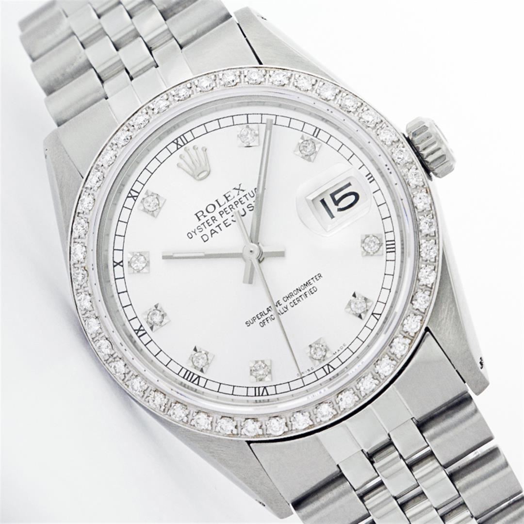 One Mens Stainless Steel Rolex Datejust Polished Bright with Satin Finish, Fully Serviced & Electronically Tested, Stainless Steel Case:36mm, Stainless Steel Crown, Custom Bezel: 18K White Gold Beadset Diamond Bezel, Diamond Count: 44 Diamonds Total Weight 1.00 Carat, Clarity: SI-VS, Color: G to H. Custom Crystal: Synthetic Sapphire Cyclops Lens. Movement: Automatic Winding Movement Caliber 3035. Custom Dial: White Dial With Diamond Hour Markers and Square Roman Track, Diamond Count: 10 Diamonds in Dial, Color: G To H, Clarity: SI-VS. Date Window: 3 O'Clock Position Date Display, Quickset, Model: Datejust, Condition: G-6 Extra Fine. Bracelet:Stainless Steel Jubilee. Bright Polish & Satin Finish. 6.5 Inch Length, Adjustable. Standard Clasp, With Rolex Logo.