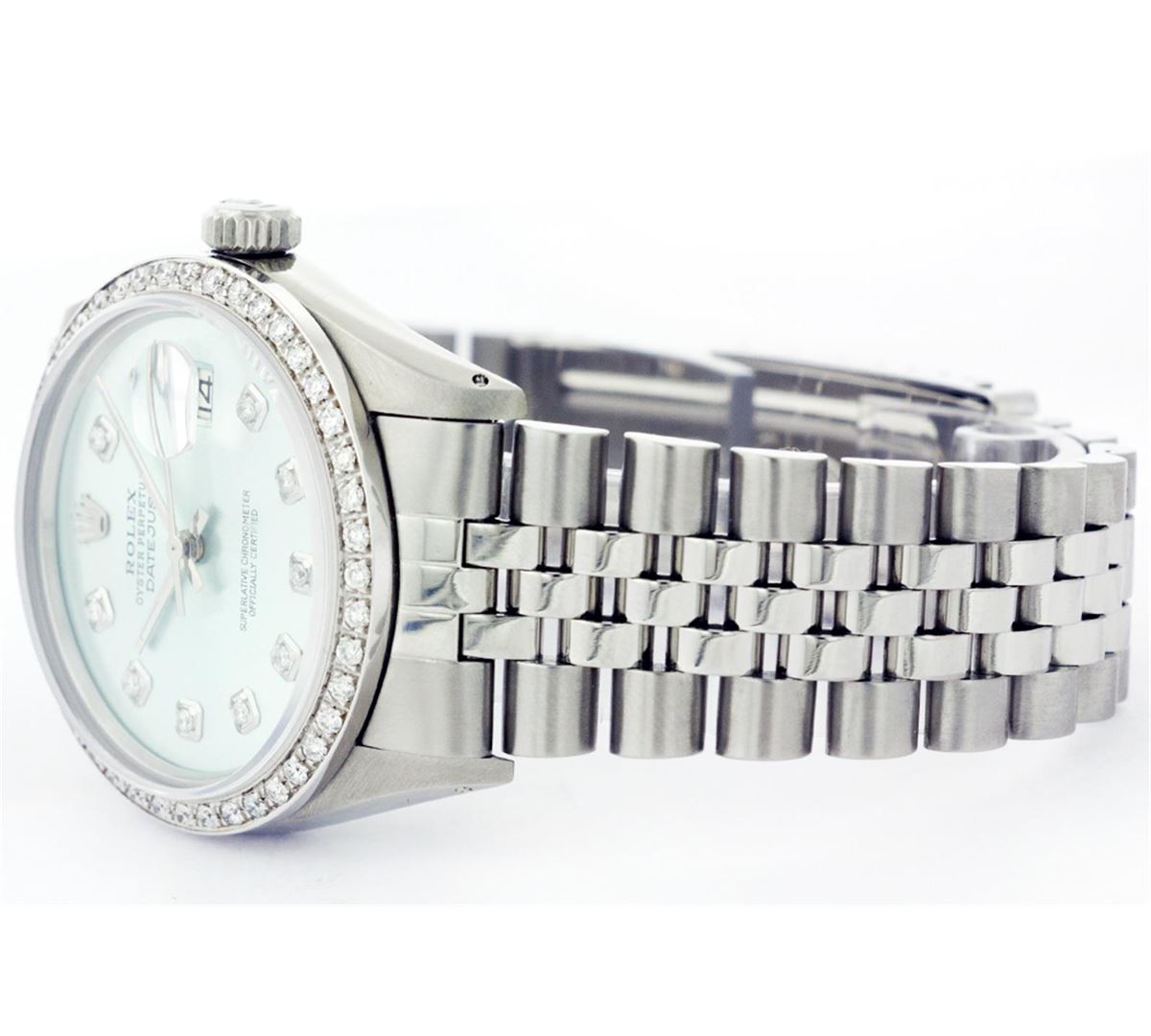 One Mens Stainless Steel Rolex Datejust Polished Bright with Satin Finish, Fully Serviced & Electronically Tested, Stainless Steel Case:36mm, Stainless Steel Crown, Custom Bezel: 18K White Gold Beadset Diamond Bezel, Diamond Count: 44 Diamonds, Total Weight 1.00 Carat, Clarity: SI-VS, Color: G to H. Custom Crystal: Synthetic Sapphire Cyclops Lens. Movement: Automatic Winding Movement Caliber 3035. Custom Dial: Ice Blue Diamond Dial, 10 Diamonds in Dial, G To H In Color, Clarity: SI-VS. Date Window: 3 O'Clock Position Date Display, Quickset, Model: Datejust, Condition: G-6 Extra Fine. Bracelet:Stainless Steel Jubilee. Bright Polish & Satin Finish. 6.5 Inch Length, Adjustable. Standard Clasp, With Rolex Logo.