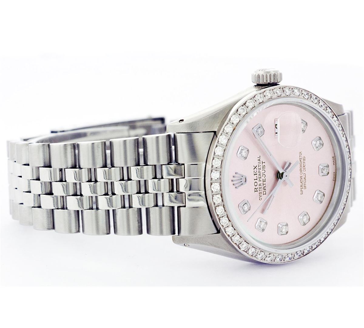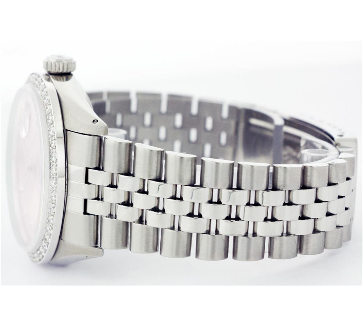 One Mens Stainless Steel Rolex Datejust Polished Bright with Satin Finish, Fully Serviced & Electronically Tested, Stainless Steel Case:36mm, Stainless Steel Crown, Custom Bezel: 18K White Gold Beadset Diamond Bezel, Diamond Count: 44 Diamonds, Total Weight 1.00 Carat, Clarity: SI-VS, Color: G to H. Custom Crystal: Synthetic Sapphire Cyclops Lens. Movement: Automatic Winding Movement Caliber 3035. Custom Dial: Ice Pink Diamond Dial, 10 Diamonds in Dial, G To H In Color, Clarity: SI-VS. Date Window: 3 O'Clock Position Date Display, Quickset, Model: Datejust, Condition: G-6 Extra Fine. Bracelet:Stainless Steel Jubilee. Bright Polish & Satin Finish. 6.5 Inch Length, Adjustable. Standard Clasp, With Rolex Logo.