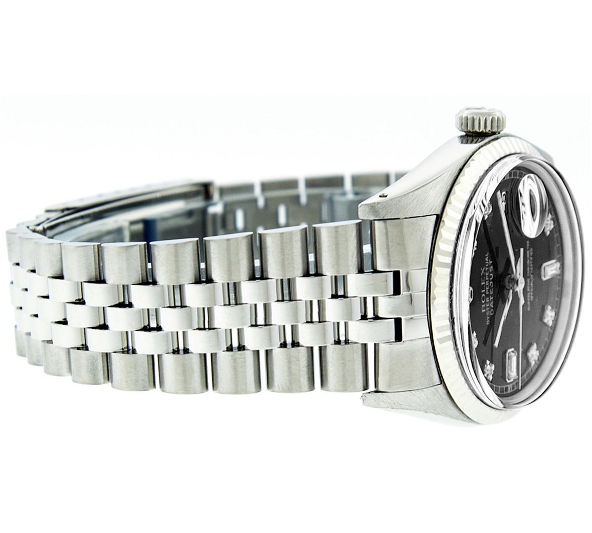 One Mens Rolex Datejust Polished, Serviced & Electronically Tested, Stainless Steel Case:36mm, Stainless Steel Crown, Bezel: 18K White Gold Fluted Bezel. Custom Crystal: Acrylic Cyclops Lens. Movement: Automatic Winding Movement Caliber 3035. Custom Dial: Black With Diamond Hour Markers and Square Roman Track Square Setting, Diamond Count: 8 Diamonds + 2 Baguettes, Clarity: SI-VS, Color: G to H. Date Window: 3 O'Clock Position Date Display, Quickset, Model: Datejust Condition: G-6 Extra Fine. Bracelet: Stainless Steel Jubilee. Bright Polish & Satin Finish. 7.0 Inch Length, Adjustable. Standard Clasp, With Rolex Logo.