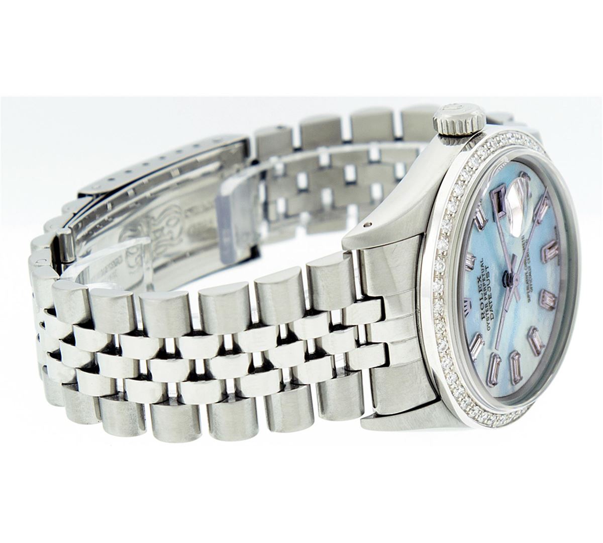 One Mens Rolex Datejust Polished, Serviced & Electronically Tested, Stainless Steel Case:36mm, Stainless Steel Crown, Custom Bezel: 18K White Gold Beadset Diamond Bezel, Diamond Count: 44 Diamonds, Total Weight 1.00 Carat, Clarity: SI-VS, Color: G to H. Custom Crystal: Synthetic Sapphire Cyclops Lens. Movement: Automatic Winding Movement Caliber 3035. Custom Dial: Blue MOP Baguette Diamond Hour Markers, Diamond Count: 10 Diamond Baguette. G To H In Color, Clarity: SI-VS. Date Window: 3 O'Clock Position Date Display, Quickset, Model: Datejust. Condition: G-6 Extra Fine. Bracelet: Stainless Steel Jubilee. Bright Polish & Satin Finish. 7.0 Inch Length, Adjustable. Standard Clasp, With Rolex Logo