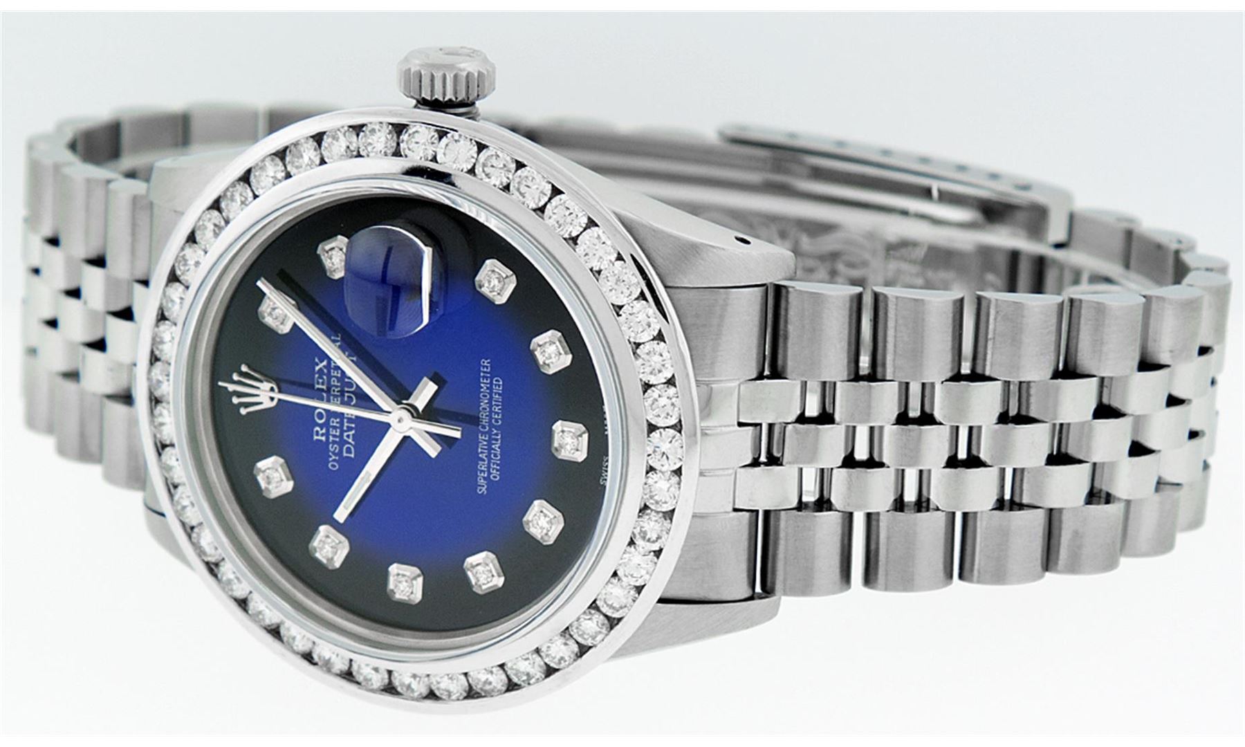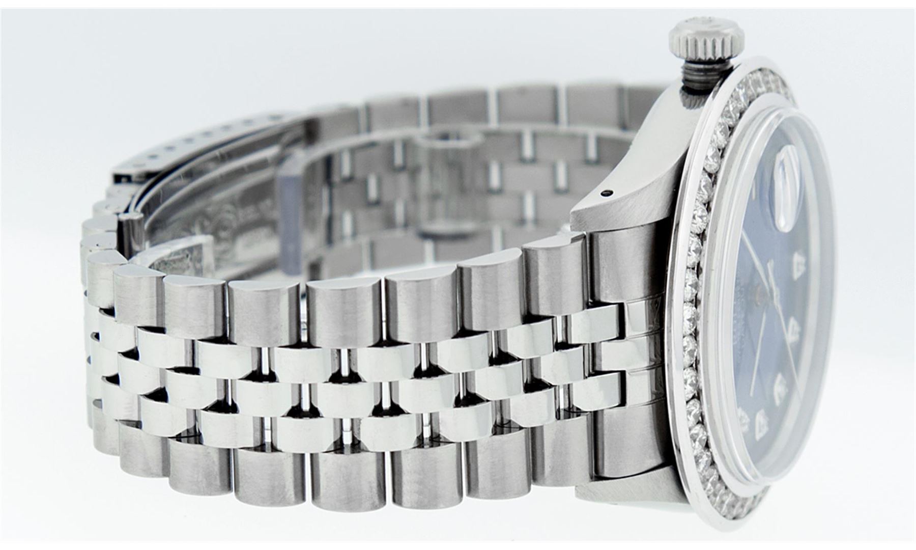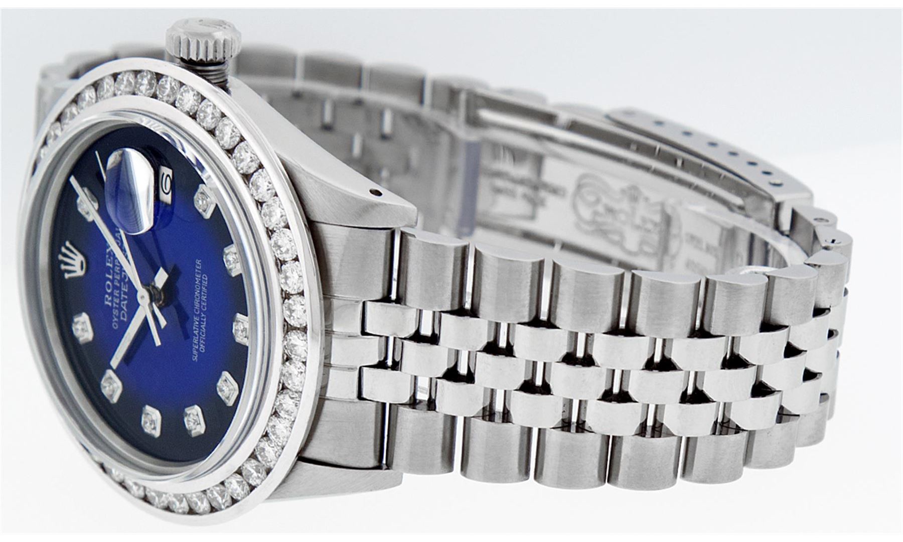 One Mens Rolex Datejust Polished Bright with Satin Finish, Serviced & Electronically Tested, Stainless Steel Case:36mm, Stainless Steel Crown, Custom Bezel: 18K White Gold 3ct Channel Set Diamond Bezel, Diamond Count: 40 Diamonds, Total Weight 3.00 Carat, Clarity: SI-VS, Color: G to H. Custom Crystal: Synthetic Sapphire Cyclops Lens. Movement: Automatic Winding Movement Caliber 3035. Custom Dial: Blue Vignette Diamond Dial, Diamond Count: 10 Diamonds In Dial, Diamond Color: G To H In Color, Clarity: SI-VS. Date Window: 3 O'Clock Position Date Display, Quickset, Model: Datejust Condition: G-6 Extra Fine. Bracelet: Stainless Steel Jubilee Band. Bright Polish & Satin Finish. 7.0 Inch Length, Adjustable. Standard Clasp, With Rolex Logo.
