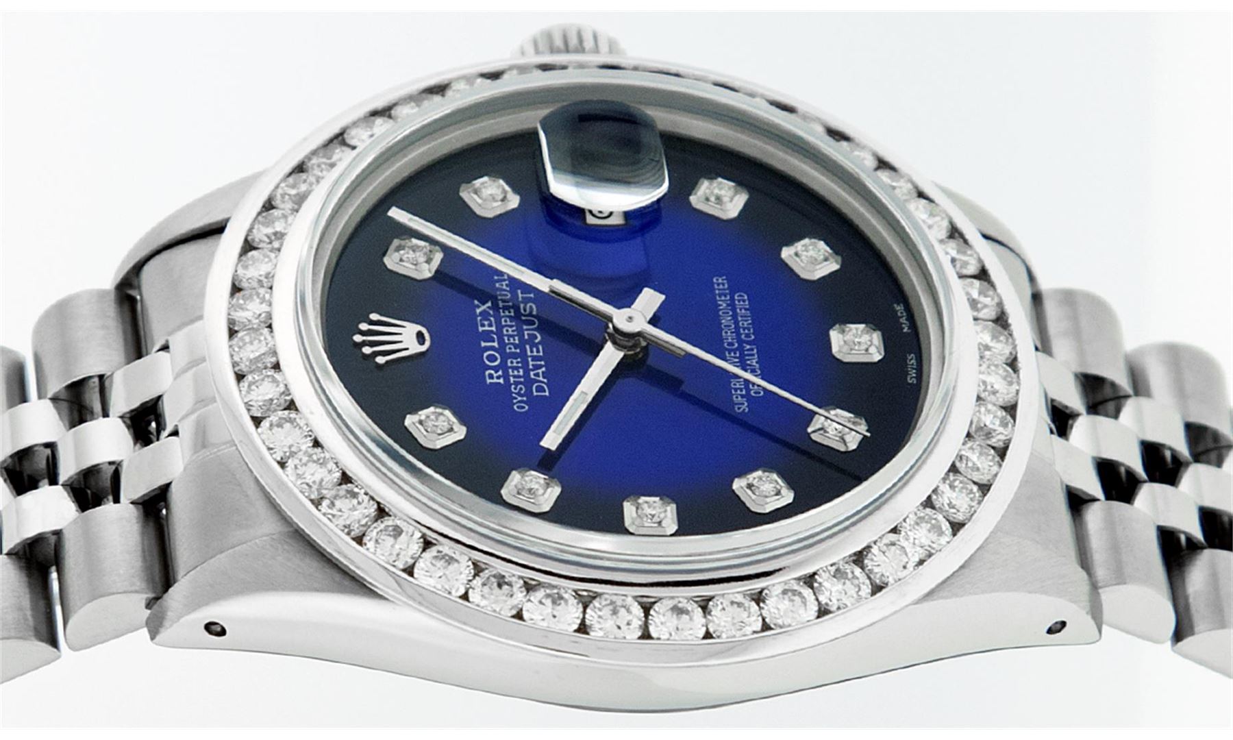 One Mens Rolex Datejust Polished Bright with Satin Finish, Serviced & Electronically Tested, Stainless Steel Case:36mm, Stainless Steel Crown, Custom Bezel: 18K White Gold 3ct Channel Set Diamond Bezel, Diamond Count: 40 Diamonds, Total Weight 3.00 Carat, Clarity: SI-VS, Color: G to H. Custom Crystal: Synthetic Sapphire Cyclops Lens. Movement: Automatic Winding Movement Caliber 3035. Custom Dial: Blue Vignette Diamond Dial, Diamond Count: 10 Diamonds In Dial, Diamond Color: G To H In Color, Clarity: SI-VS. Date Window: 3 O'Clock Position Date Display, Quickset, Model: Datejust Condition: G-6 Extra Fine. Bracelet: Stainless Steel Jubilee Band. Bright Polish & Satin Finish. 7.0 Inch Length, Adjustable. Standard Clasp, With Rolex Logo.
