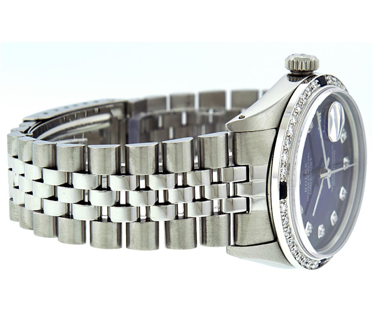 One Mens Rolex Datejust Polished Bright with Satin Finish, Serviced & Electronically Tested, Stainless Steel Case:36mm, Stainless Steel Crown, Custom Bezel: 18K White Gold Sapphire Beadset Diamond Bezel, Diamond + Gem Count: 36 Diamonds + 4 Sapphires Total Weight 1.00 Carat, Clarity: Si-VS, Color: G to H. Custom Crystal: Synthetic Sapphire Cyclops Lens. Movement: Automatic Winding Movement Caliber 3035. Custom Dial: Blue Vignette With Diamond Hour Markers, 10 Diamond in Dial G To H In Color, Si-VS Clarity. Date Window: 3 O'Clock Position Date Display, Quickset, Model: Datejust. Condition: G-6 Extra Fine. Bracelet:Stainless Steel Jubilee. Bright Polish & Satin Finish. 7.0 Inch Length, Adjustable. Standard Clasp, With Rolex Logo.