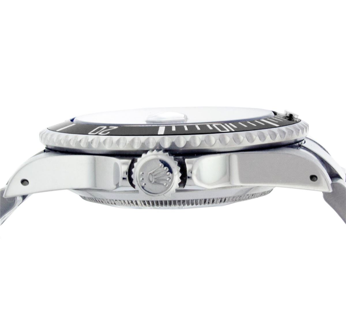 One Mens Rolex Submariner With Date Polished, Serviced & Electronically Tested, Stainless Steel Case:41mm, Stainless Steel Crown, Bezel: Stainless Steel Rotatable Bezel With Black Insert. Crystal: Synthetic Sapphire Cyclops Lens. Movement: Automatic Winding Movement Caliber 3035. Custom Dial: Blue Submariner Diamond Dial, Diamond Count: 8 Diamonds + 2 Baguette Diamonds, Color: G To H, Clairty: SI-VS. Date Window: 3 O'Clock Position Date Display, Model: Submariner 16800, Quickset, Condition: G-6 Extra Fine. Bracelet:Stainless Steel Oyster. Bright Polish & Satin Finish. 6.75 Inch Length, Adjustable. Standard Clasp, With Rolex Logo.