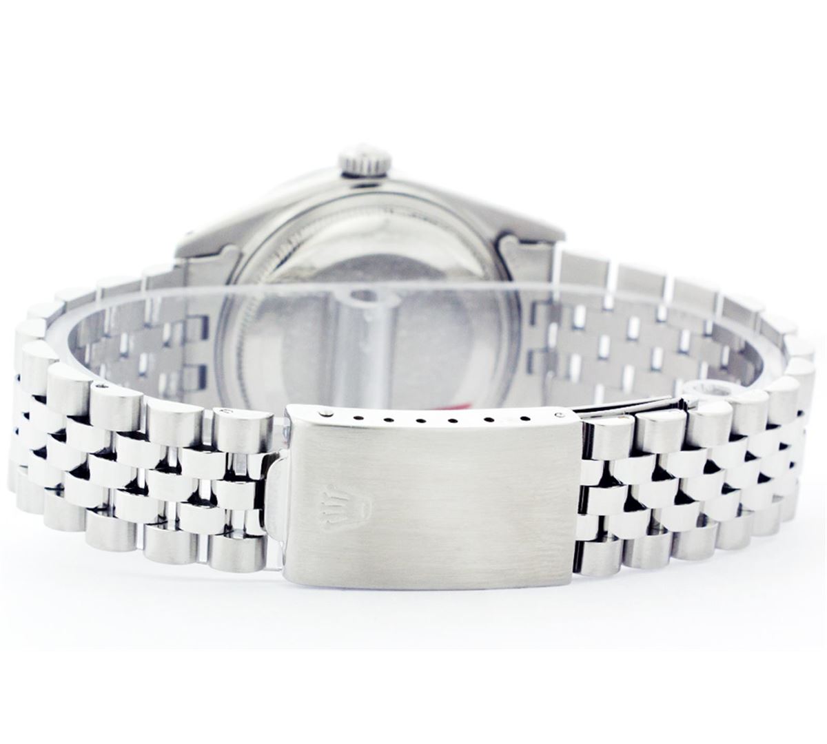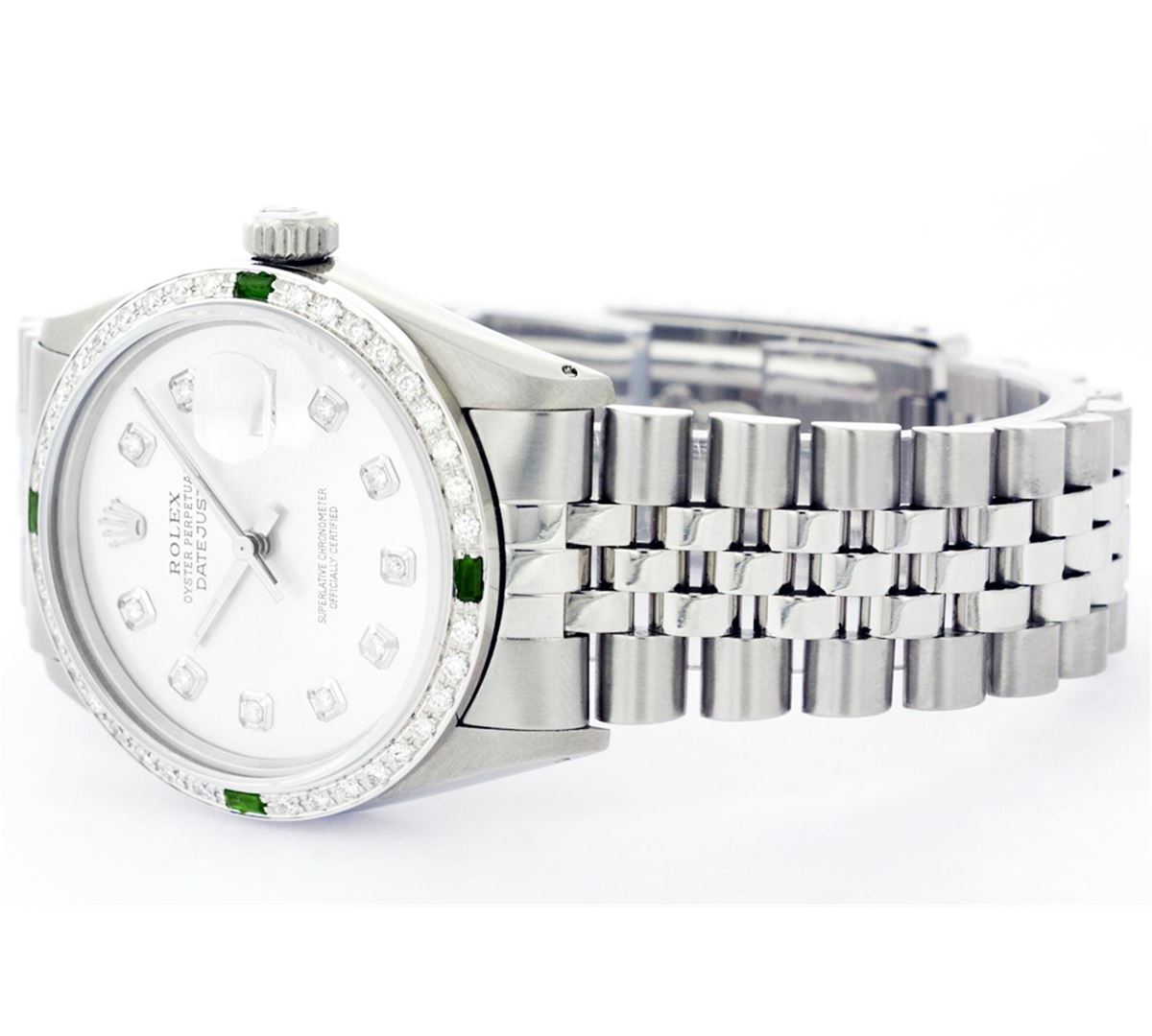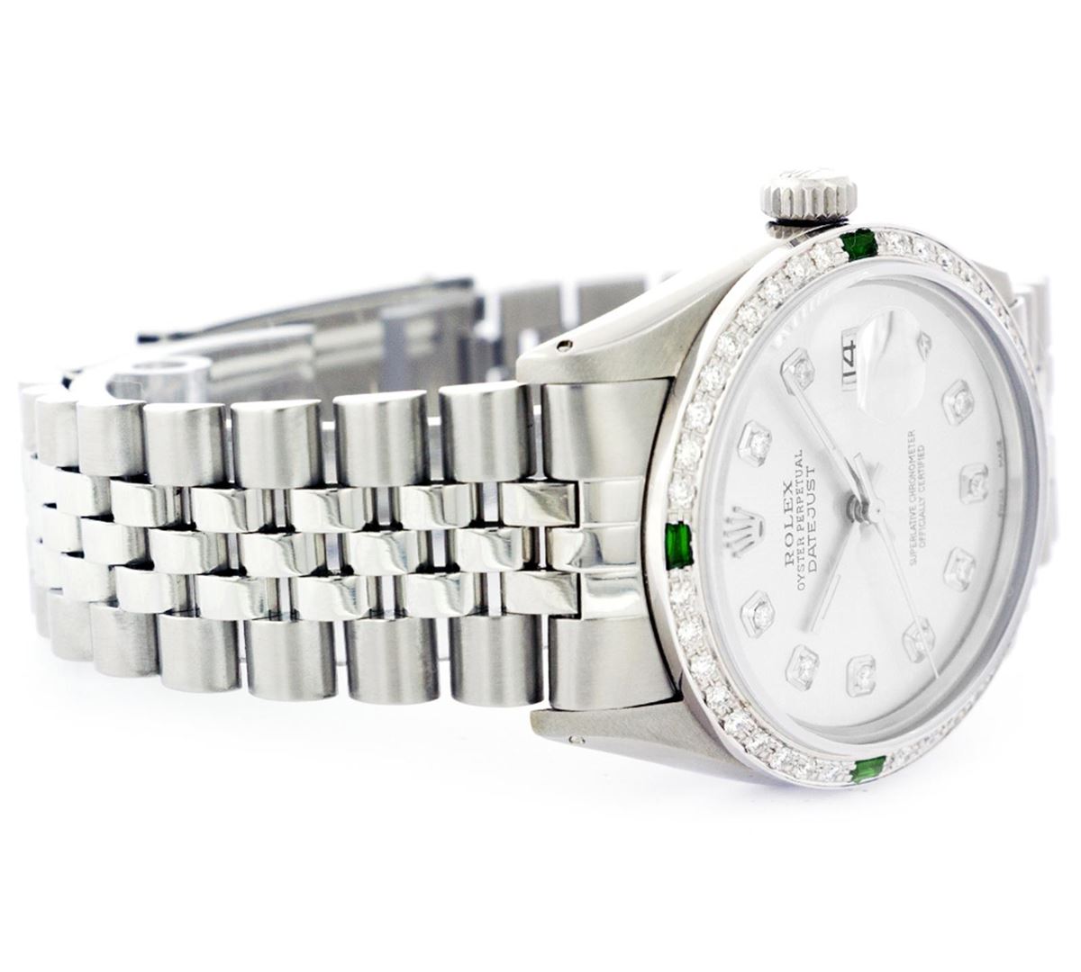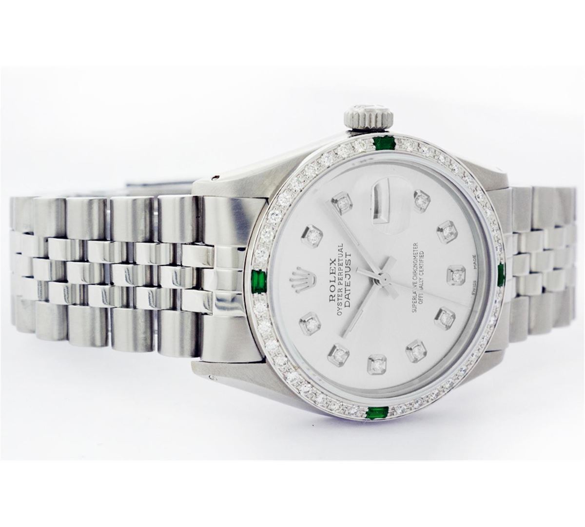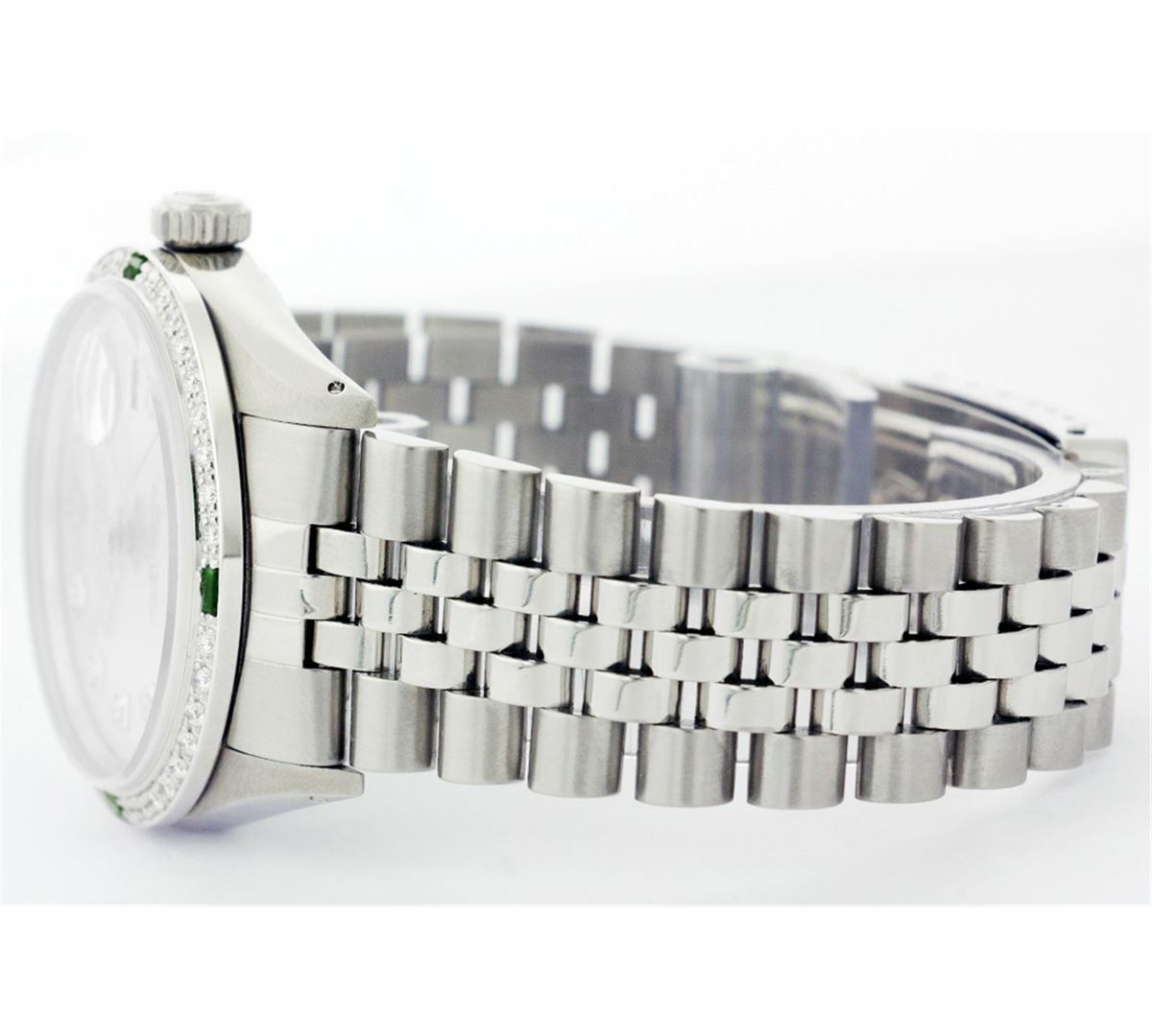 One Mens Stainless Steel Rolex Datejust Polished Bright with Satin Finish, Fully Serviced & Electronically Tested, Stainless Steel Case:36mm, Stainless Steel Crown, Custom Bezel: 18K White Gold Emerald Beadset Diamond Bezel, Diamond Count: 36 Diamonds + 4 Emeralds, Total Weight 1.00 Carat, Clarity: SI-VS, Color: G to H. Custom Crystal: Synthetic Sapphire Cyclops Lens. Movement: Automatic Winding Movement Caliber 3035. Custom Dial: Silver Diamond Dial, 10 Diamonds in Dial, G To H In Color, Clarity: SI-VS. Date Window: 3 O'Clock Position Date Display, Quickset, Model: Datejust, Condition: G-6 Extra Fine. Bracelet:Stainless Steel Jubilee. Bright Polish & Satin Finish. 6.5 Inch Length, Adjustable. Standard Clasp, With Rolex Logo.