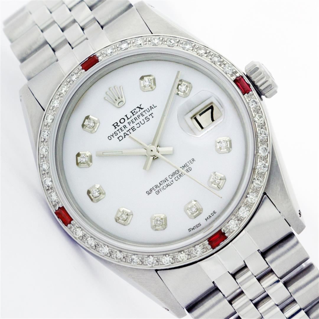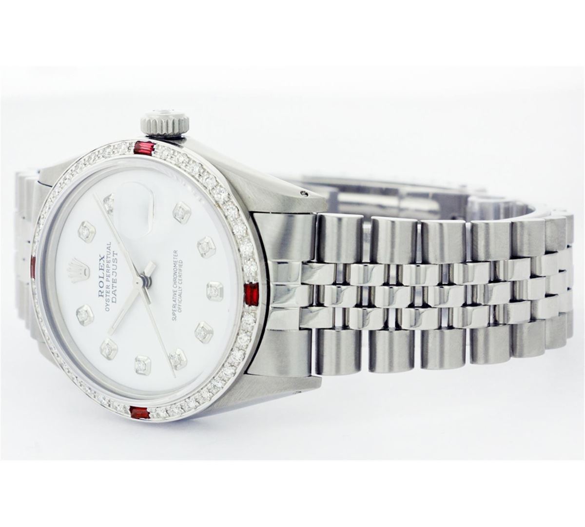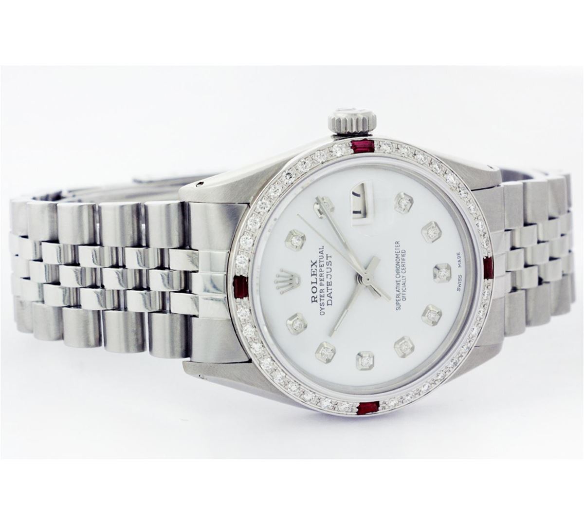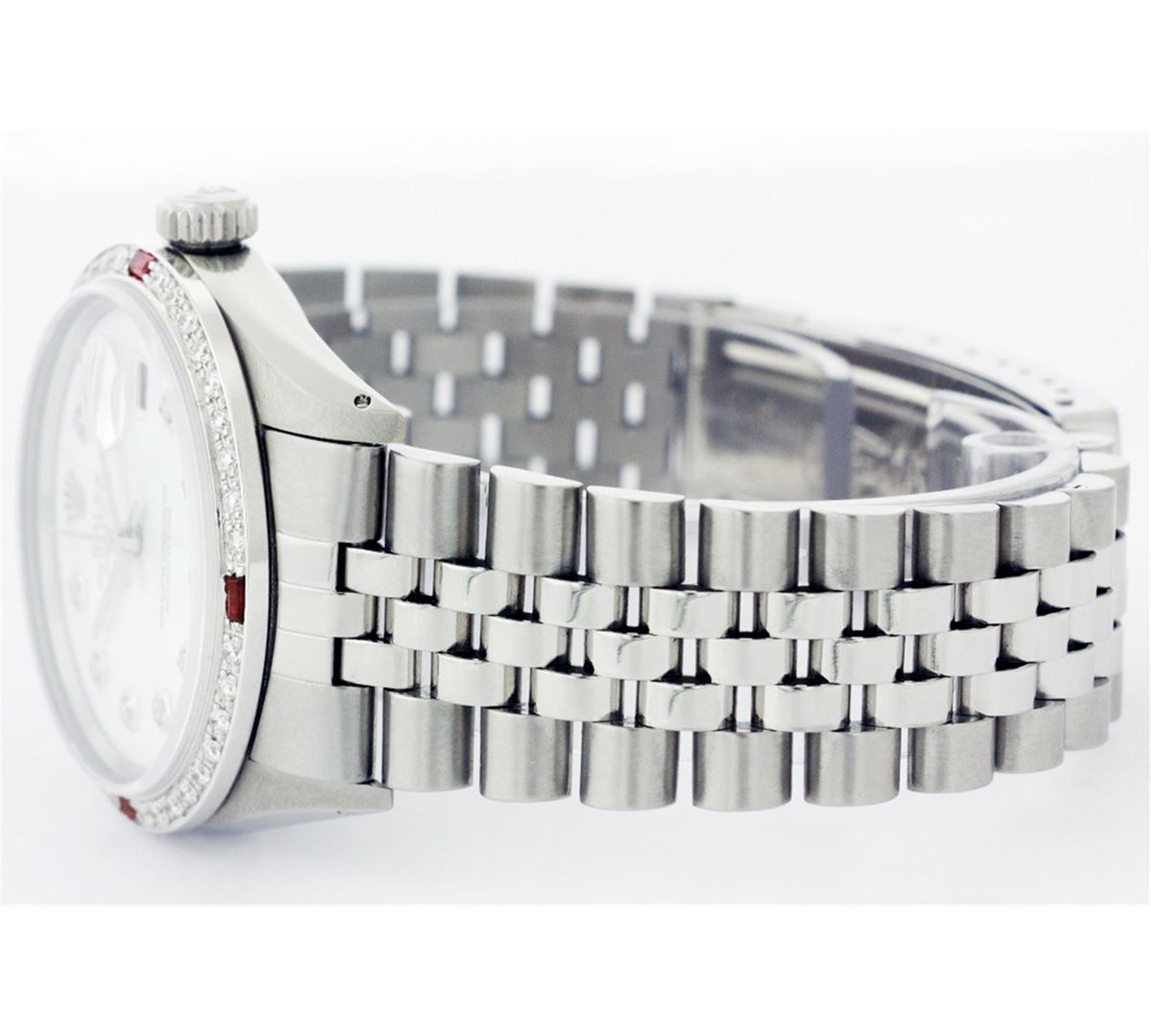One Mens Stainless Steel Rolex Datejust Polished Bright with Satin Finish, Fully Serviced & Electronically Tested, Stainless Steel Case:36mm, Stainless Steel Crown, Custom Bezel: 18K White Gold Ruby Beadset Diamond Bezel, Diamond Count: 36 Diamonds + 4 Rubies, Total Weight 1.00 Carat, Clarity: SI-VS, Color: G to H. Custom Crystal: Synthetic Sapphire Cyclops Lens. Movement: Automatic Winding Movement Caliber 3035. Custom Dial: Mother Of Pearl Diamond Dial, 10 Diamonds in Dial, G To H In Color, Clarity: SI-VS. Date Window: 3 O'Clock Position Date Display, Quickset, Model: Datejust, Condition: G-6 Extra Fine. Bracelet:Stainless Steel Jubilee. Bright Polish & Satin Finish. 6.5 Inch Length, Adjustable. Standard Clasp, With Rolex Logo.