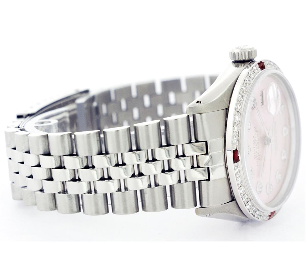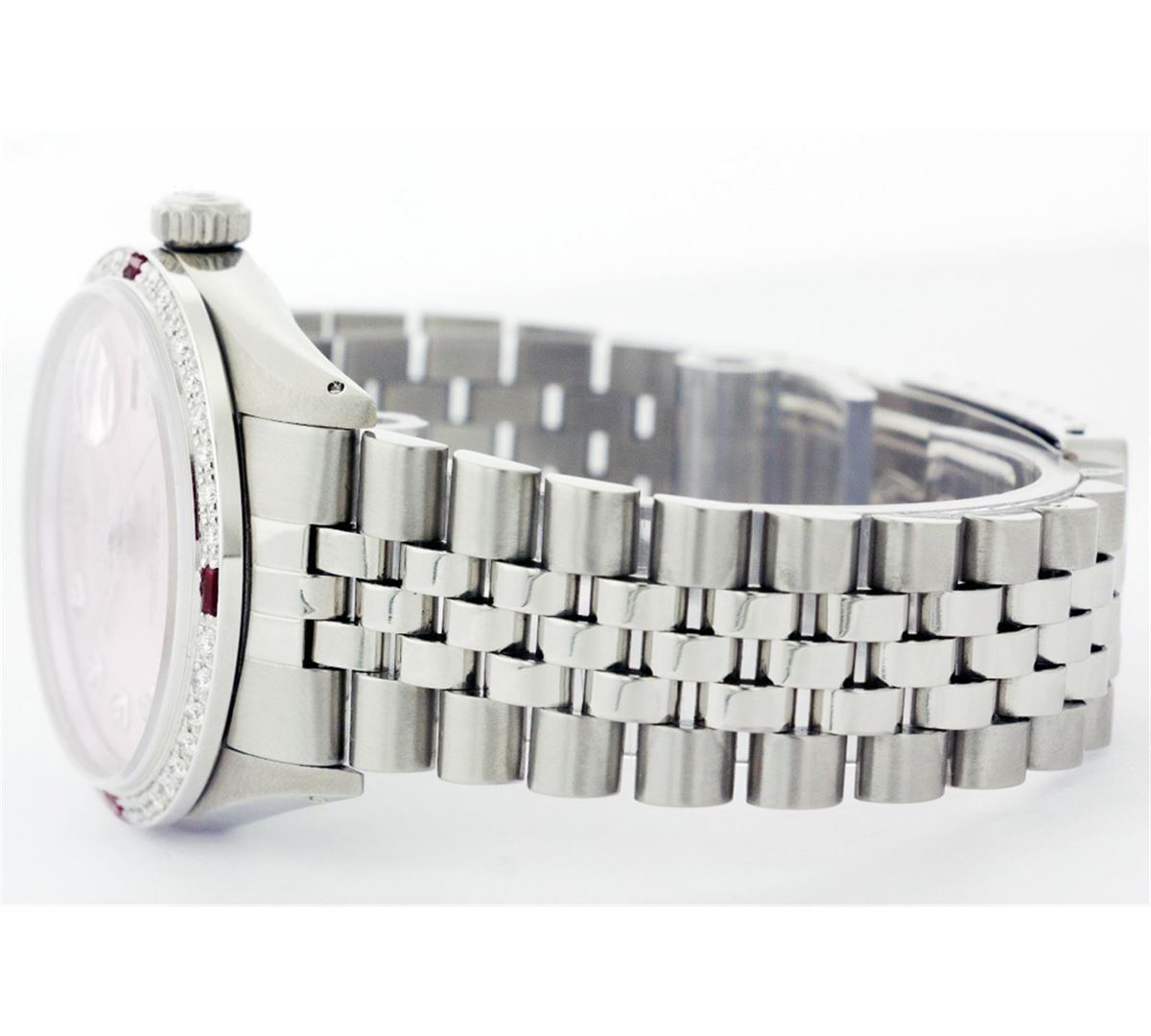 One Mens Stainless Steel Rolex Datejust Polished Bright with Satin Finish, Fully Serviced & Electronically Tested, Stainless Steel Case:36mm, Stainless Steel Crown, Custom Bezel: 18K White Gold Ruby Beadset Diamond Bezel, Diamond Count: 36 Diamonds + 4 Rubies, Total Weight 1.00 Carat, Clarity: SI-VS, Color: G to H. Custom Crystal: Synthetic Sapphire Cyclops Lens. Movement: Automatic Winding Movement Caliber 3035. Custom Dial: Ice Pink Diamond Dial, 10 Diamonds in Dial, G To H In Color, Clarity: SI-VS. Date Window: 3 O'Clock Position Date Display, Quickset, Model: Datejust, Condition: G-6 Extra Fine. Bracelet:Stainless Steel Jubilee. Bright Polish & Satin Finish. 6.5 Inch Length, Adjustable. Standard Clasp, With Rolex Logo.