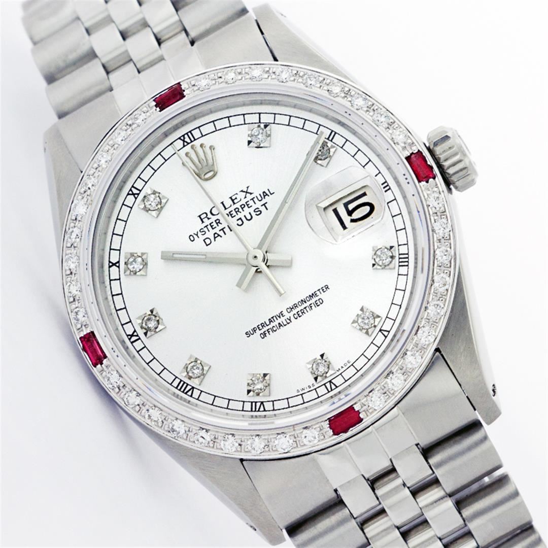One Mens Stainless Steel Rolex Datejust Polished Bright with Satin Finish, Fully Serviced & Electronically Tested, Stainless Steel Case:36mm, Stainless Steel Crown, Custom Bezel: 18K White Gold Ruby Beadset Diamond Bezel, Diamond Count: 36 Diamonds + 4 Rubies, Total Weight 1.00 Carat, Clarity: SI-VS, Color: G to H. Custom Crystal: Synthetic Sapphire Cyclops Lens. Movement: Automatic Winding Movement Caliber 3035. Custom Dial: White Dial With Diamond Hour Markers and Square Roman Track, 10 Diamonds in Dial G To H In Color, Clarity: SI-VS. Date Window: 3 O'Clock Position Date Display, Quickset, Model: Datejust, Condition: G-6 Extra Fine. Bracelet:Stainless Steel Jubilee. Bright Polish & Satin Finish. 6.5 Inch Length, Adjustable. Standard Clasp, With Rolex Logo.
