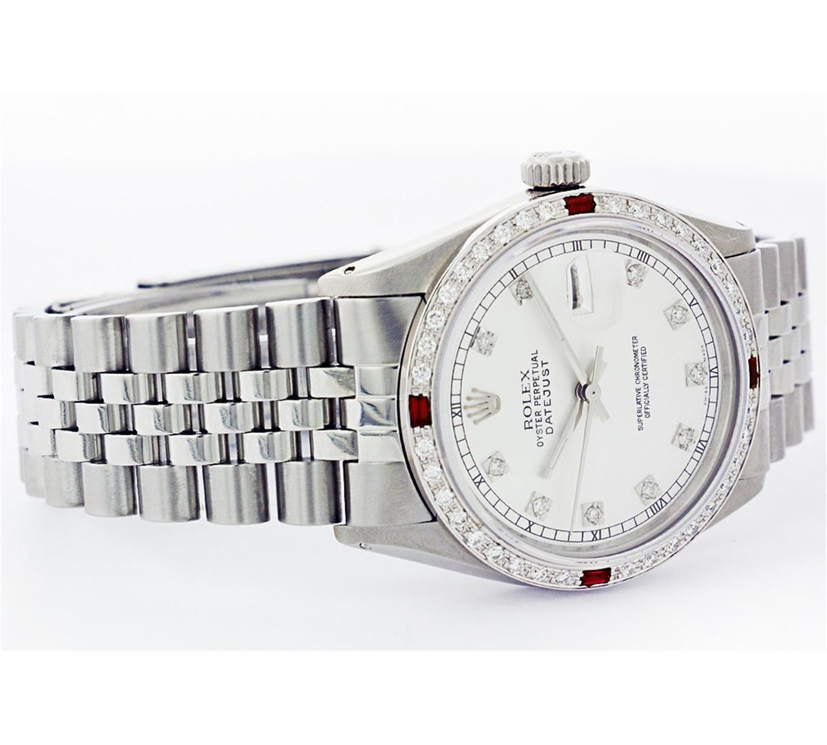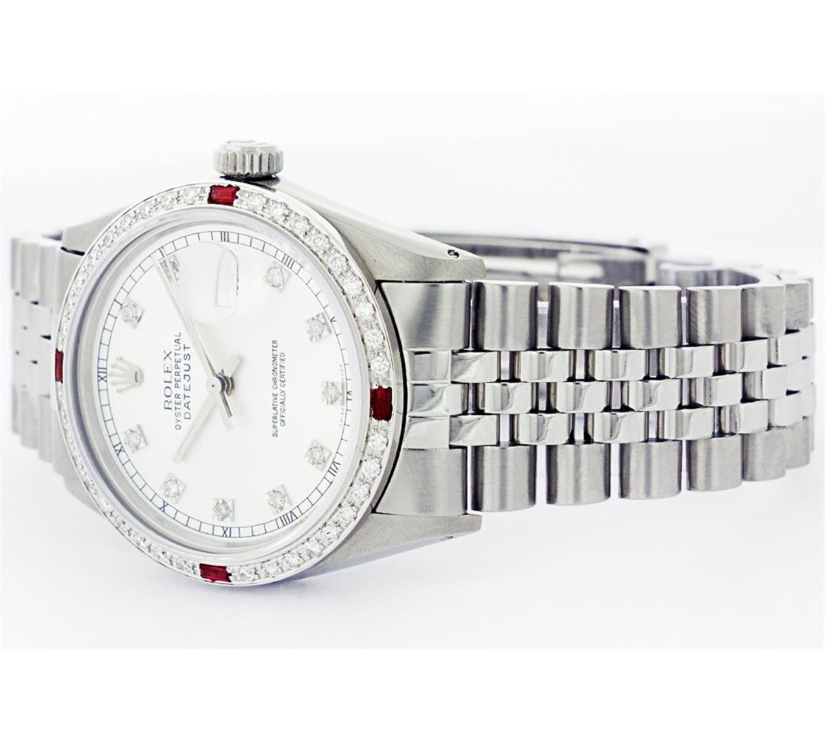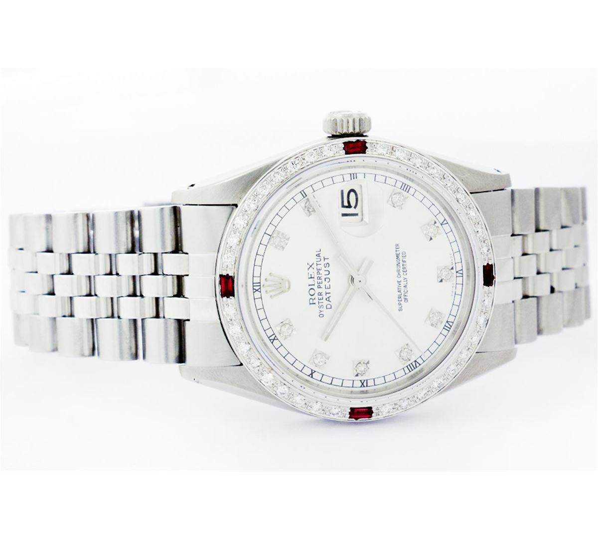 One Mens Stainless Steel Rolex Datejust Polished Bright with Satin Finish, Fully Serviced & Electronically Tested, Stainless Steel Case:36mm, Stainless Steel Crown, Custom Bezel: 18K White Gold Ruby Beadset Diamond Bezel, Diamond Count: 36 Diamonds + 4 Rubies, Total Weight 1.00 Carat, Clarity: SI-VS, Color: G to H. Custom Crystal: Synthetic Sapphire Cyclops Lens. Movement: Automatic Winding Movement Caliber 3035. Custom Dial: White Dial With Diamond Hour Markers and Square Roman Track, 10 Diamonds in Dial G To H In Color, Clarity: SI-VS. Date Window: 3 O'Clock Position Date Display, Quickset, Model: Datejust, Condition: G-6 Extra Fine. Bracelet:Stainless Steel Jubilee. Bright Polish & Satin Finish. 6.5 Inch Length, Adjustable. Standard Clasp, With Rolex Logo.