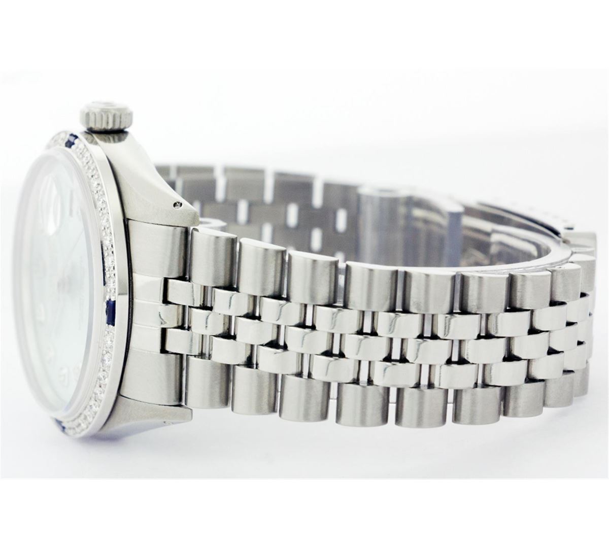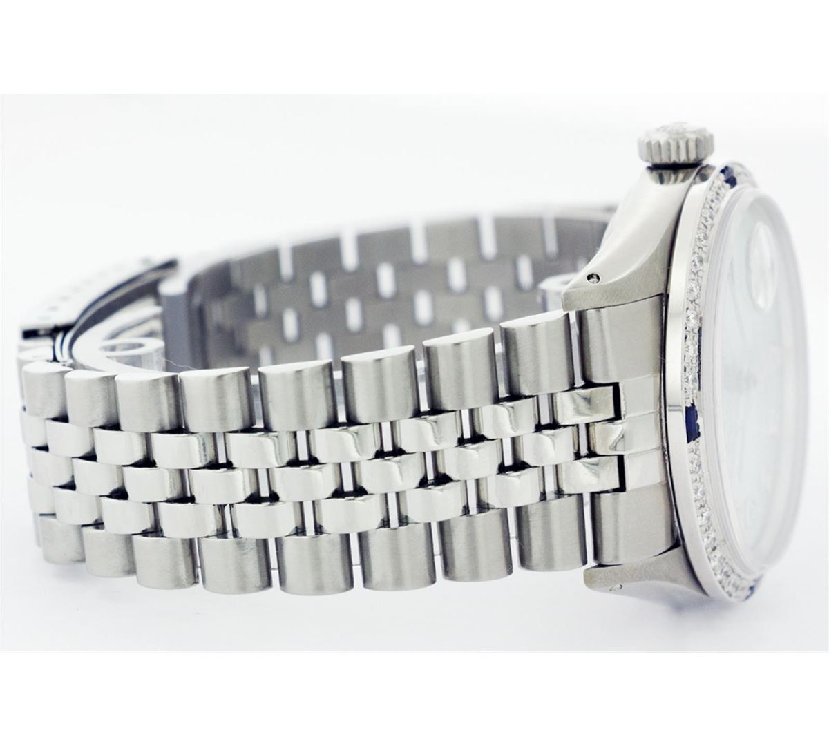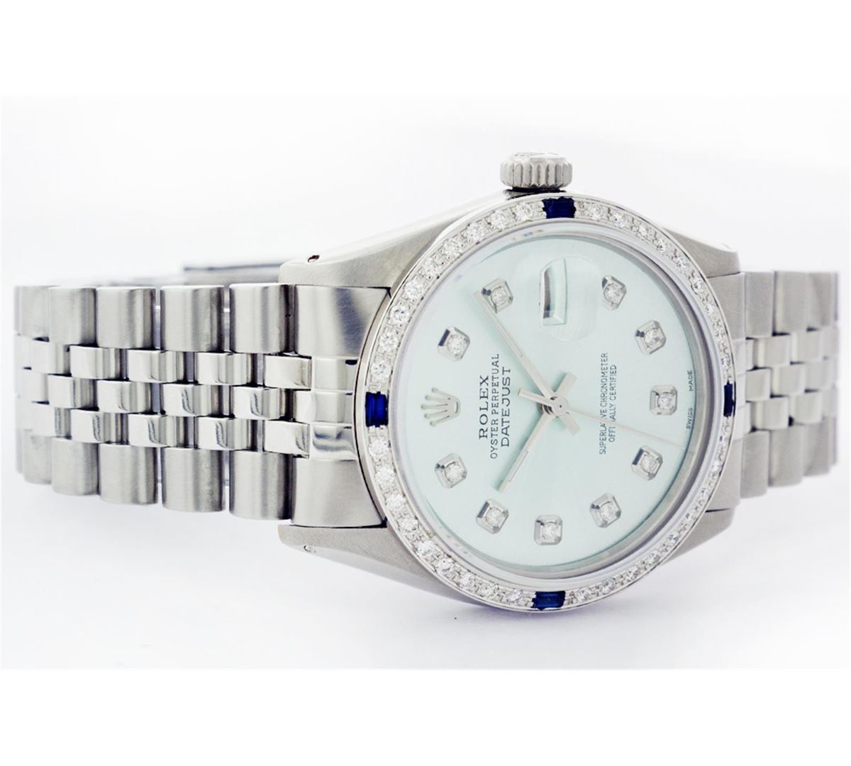 One Mens Stainless Steel Rolex Datejust Polished Bright with Satin Finish, Fully Serviced & Electronically Tested, Stainless Steel Case:36mm, Stainless Steel Crown, Custom Bezel: 18K White Gold Sapphire Beadset Diamond Bezel, Diamond Count: 36 Diamonds + 4 Sapphire, Total Weight 1.00 Carat, Clarity: SI-VS, Color: G to H. Custom Crystal: Synthetic Sapphire Cyclops Lens. Movement: Automatic Winding Movement Caliber 3035. Custom Dial: Ice Blue Diamond Dial, 10 Diamonds in Dial, G To H In Color, Clarity: SI-VS. Date Window: 3 O'Clock Position Date Display, Quickset, Model: Datejust, Condition: G-6 Extra Fine. Bracelet:Stainless Steel Jubilee. Bright Polish & Satin Finish. 6.5 Inch Length, Adjustable. Standard Clasp, With Rolex Logo.