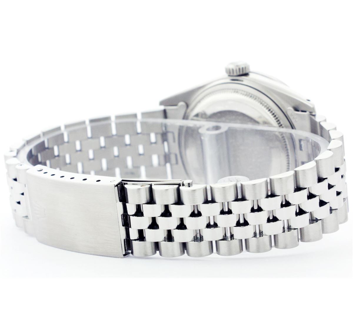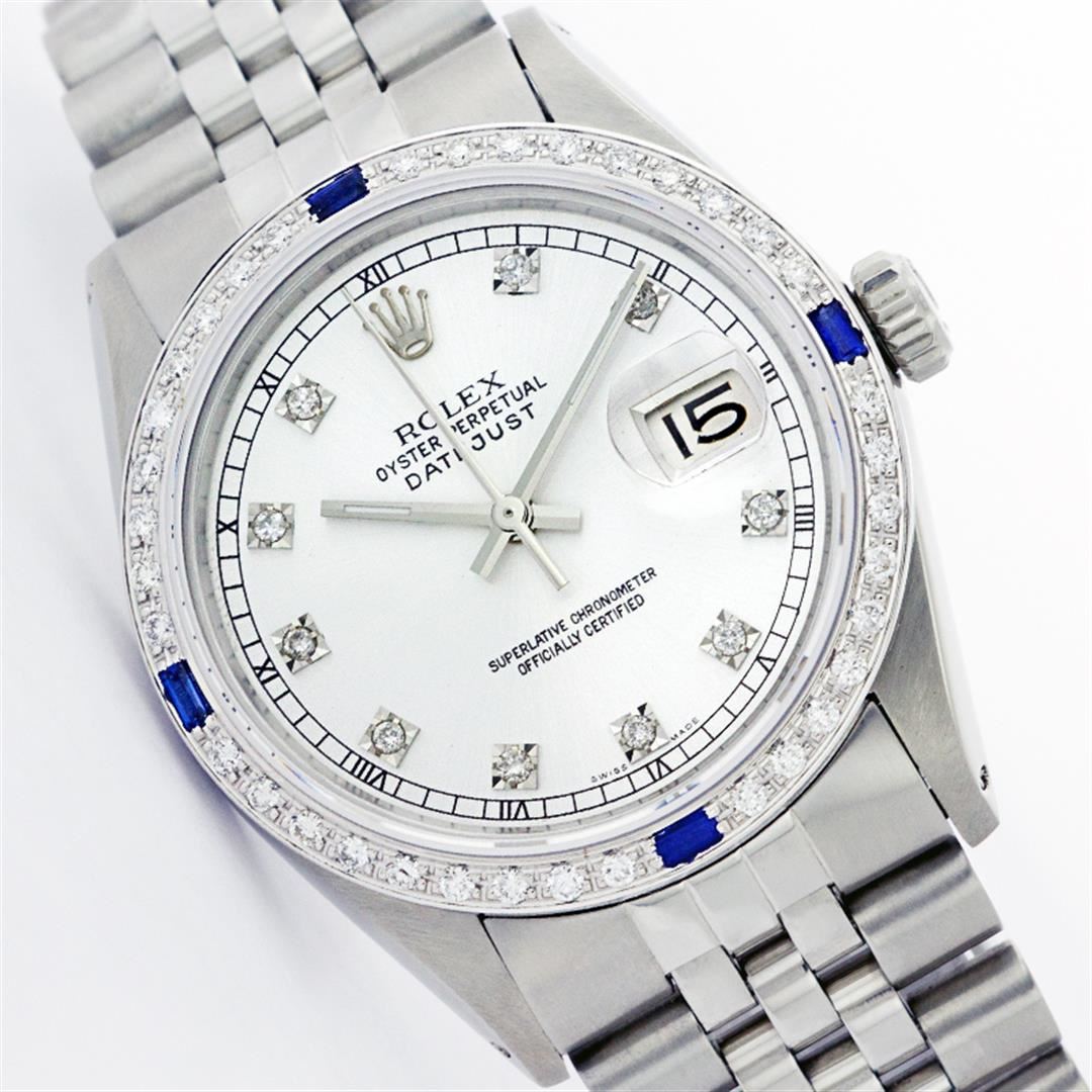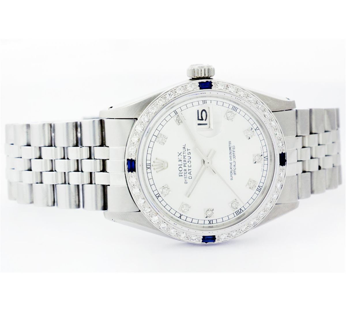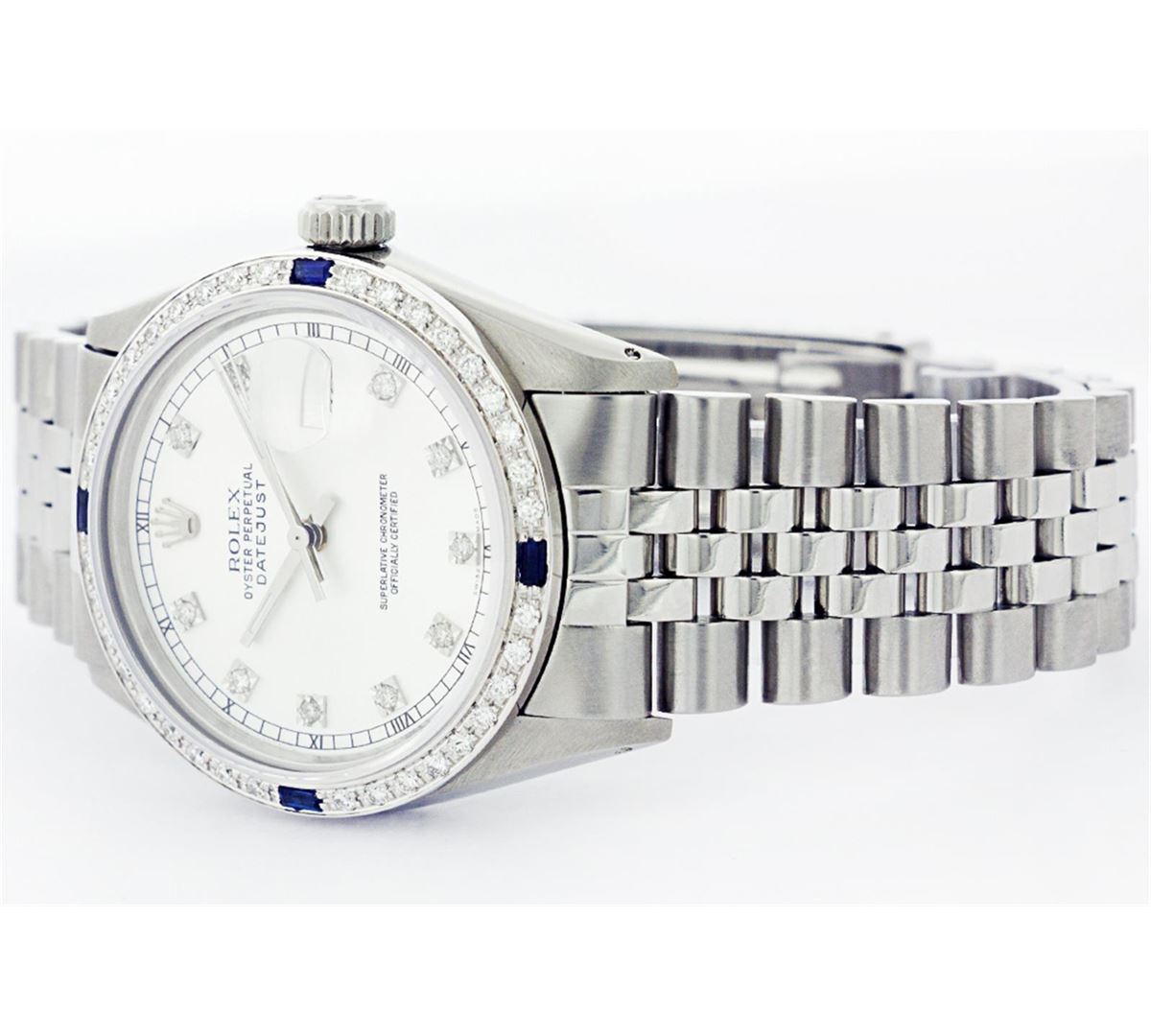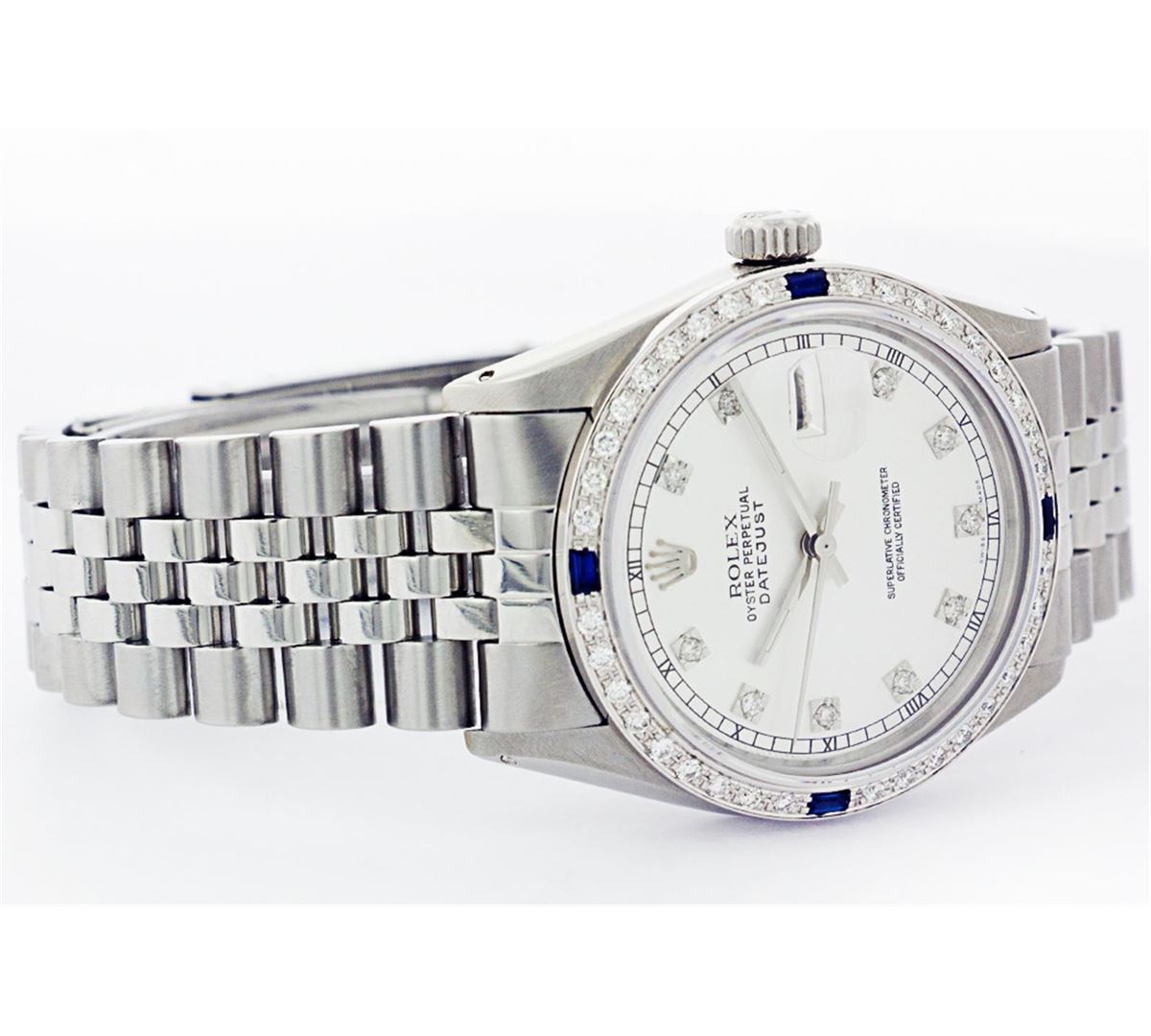One Mens Stainless Steel Rolex Datejust Polished Bright with Satin Finish, Fully Serviced & Electronically Tested, Stainless Steel Case:36mm, Stainless Steel Crown, Custom Bezel: 18K White Gold Sapphire Beadset Diamond Bezel, Diamond Count: 36 Diamonds + 4 Sapphires Total Weight 1.00 Carat, Clarity: SI-VS, Color: G to H. Custom Crystal: Synthetic Sapphire Cyclops Lens. Movement: Automatic Winding Movement Caliber 3035. Custom Dial: White Dial With Diamond Hour Markers and Square Roman Track, 10 Diamonds in Dial G To H In Color, Clarity: SI-VS. Date Window: 3 O'Clock Position Date Display, Quickset, Model: Datejust, Condition: G-6 Extra Fine. Bracelet:Stainless Steel Jubilee. Bright Polish & Satin Finish. 6.5 Inch Length, Adjustable. Standard Clasp, With Rolex Logo.
