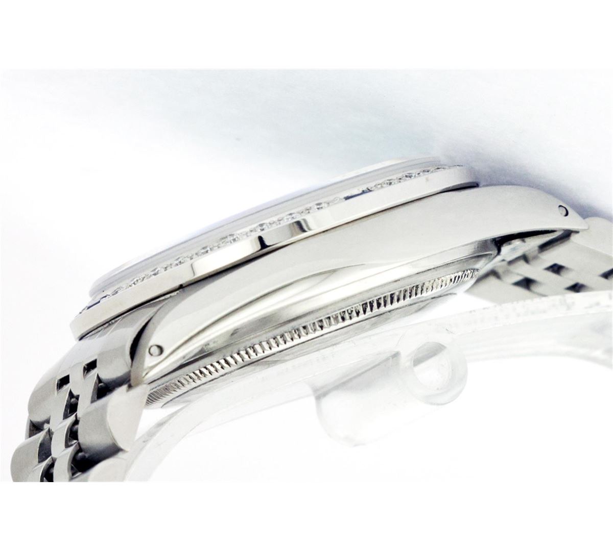 One Mens Stainless Steel Rolex Datejust Polished Bright with Satin Finish, Fully Serviced & Electronically Tested, Stainless Steel Case:36mm, Stainless Steel Crown, Custom Bezel: 18K White Gold Sapphire Beadset Diamond Bezel, Diamond Count: 36 Diamonds + 4 Sapphires, Total Weight 1.00 Carat, Clarity: SI-VS, Color: G to H. Custom Crystal: Synthetic Sapphire Cyclops Lens. Movement: Automatic Winding Movement Caliber 3035. Custom Dial: Silver Diamond Dial, 10 Diamonds in Dial G To H In Color, Clarity: SI-VS. Date Window: 3 O'Clock Position Date Display, Quickset, Model: Datejust, Condition: G-6 Extra Fine. Bracelet:Stainless Steel Jubilee. Bright Polish & Satin Finish. 6.5 Inch Length, Adjustable. Standard Clasp, With Rolex Logo.