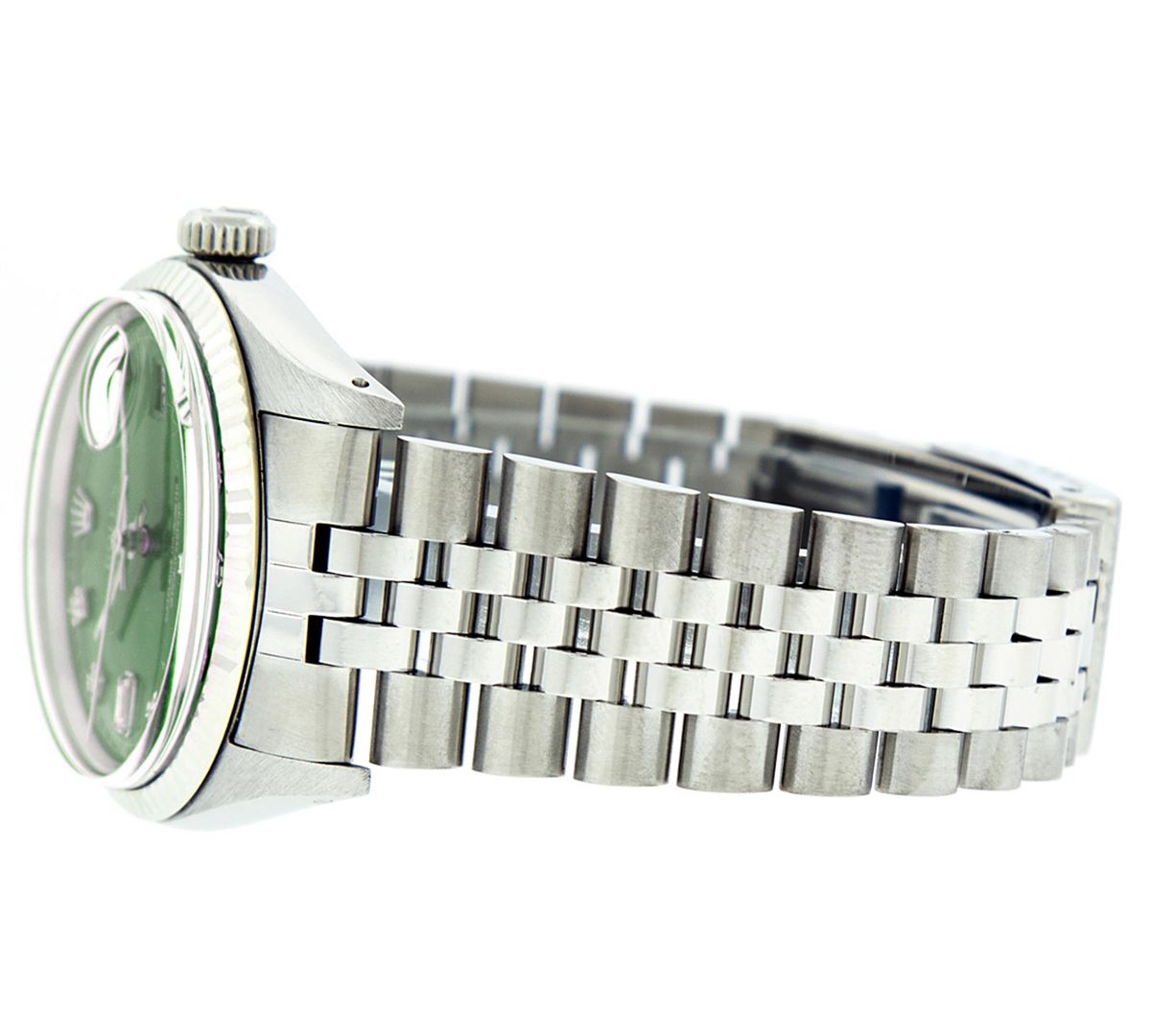 One Mens Rolex Datejust Polished, Serviced & Electronically Tested, Stainless Steel Case:36mm, Stainless Steel Crown, Bezel: 14K White Gold Fluted Bezel. Custom Crystal: Acrylic Cyclops Lens. Movement: Automatic Winding Movement Caliber 3035. Custom Dial: Green With Diamond Hour Markers and Square Roman Track Square Setting, Diamond Count: 8 Diamonds + 2 Baguettes, Clarity: SI-VS, Color: G to H. Date Window: 3 O'Clock Position Date Display, Quickset, Model: Datejust Condition: G-6 Extra Fine. Bracelet: Stainless Steel Jubilee. Bright Polish & Satin Finish. 7.0 Inch Length, Adjustable. Standard Clasp, With Rolex Logo.