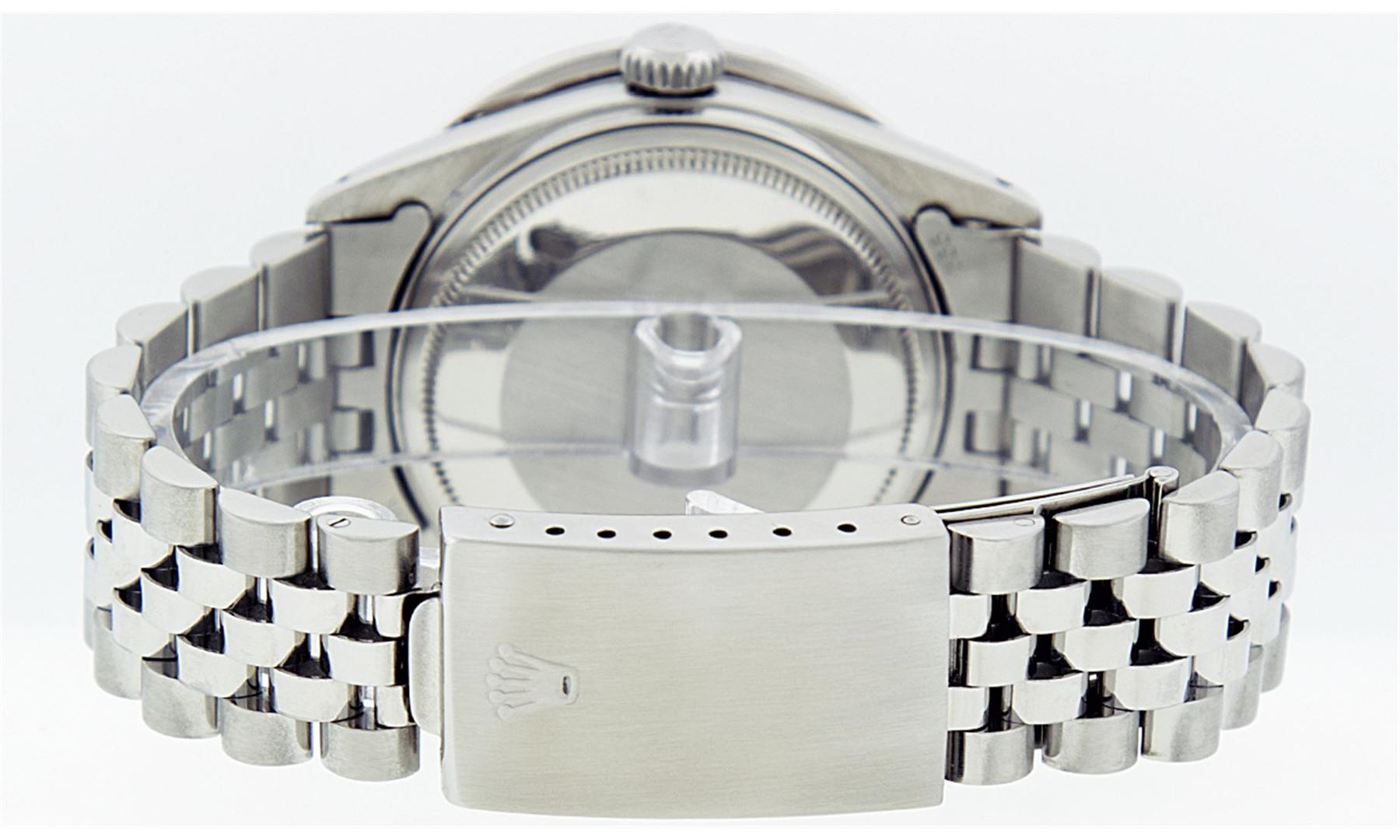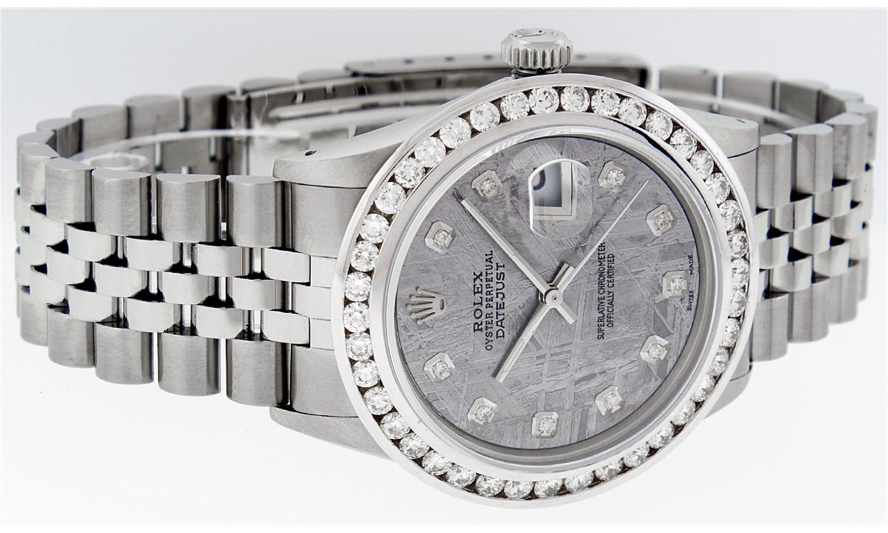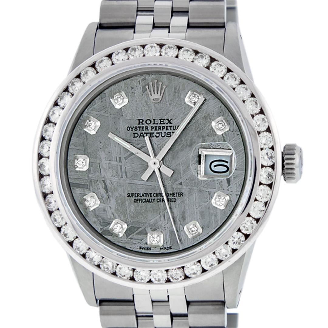 One Mens Rolex Datejust Polished Bright with Satin Finish, Serviced & Electronically Tested, Stainless Steel Case:36mm, Stainless Steel Crown, Custom Bezel: 18K White Gold 3ct Channel Set Diamond Bezel, Diamond Count: 40 Diamonds, Total Weight 3.00 Carat, Clarity: SI-VS, Color: G to H. Custom Crystal: Synthetic Sapphire Cyclops Lens. Movement: Automatic Winding Movement Caliber 3035. Custom Dial: Meteorite Diamond Dial, Diamond Count: 10 Diamonds In Dial, Diamond Color: G To H In Color, Clarity: SI-VS. Date Window: 3 O'Clock Position Date Display, Quickset, Model: Datejust Condition: G-6 Extra Fine. Bracelet: Stainless Steel Jubilee Band. Bright Polish & Satin Finish. 7.0 Inch Length, Adjustable. Standard Clasp, With Rolex Logo.