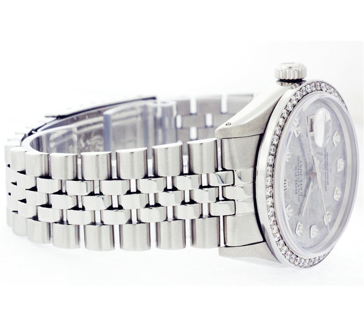 One Mens Stainless Steel Rolex Datejust Polished Bright with Satin Finish, Fully Serviced & Electronically Tested, Stainless Steel Case:36mm, Stainless Steel Crown, Custom Bezel: Satinless Steel Beadset Diamond Bezel, Diamond Count: 54 Diamonds Total Weight 1.00 Carat, Clarity: SI-VS, Color: G to H. Custom Crystal: Synthetic Sapphire Cyclops Lens. Movement: Automatic Winding Movement Caliber 3035. Custom Dial: Meteorite Dial With Diamond Hour Markers, 10 Diamonds in Dial G To H In Color, Clarity: SI-VS. Date Window: 3 O'Clock Position Date Display, Quickset, Model: Datejust, Condition: G-6 Extra Fine. Bracelet:Stainless Steel Jubilee. Bright Polish & Satin Finish. 6.5 Inch Length, Adjustable. Standard Clasp, With Rolex Logo.