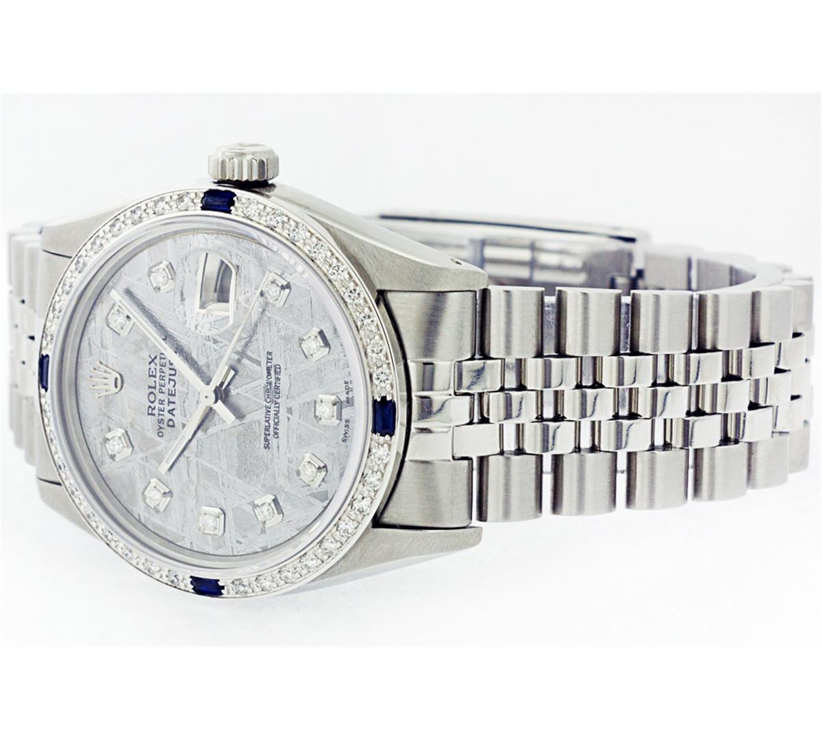 One Mens Stainless Steel Rolex Datejust Polished Bright with Satin Finish, Fully Serviced & Electronically Tested, Stainless Steel Case:36mm, Stainless Steel Crown, Custom Bezel: 18K White Gold Sapphire Beadset Diamond Bezel, Diamond Count: 36 Diamonds + 4 Sapphire, Total Weight 1.00 Carat, Clarity: SI-VS, Color: G to H. Custom Crystal: Synthetic Sapphire Cyclops Lens. Movement: Automatic Winding Movement Caliber 3035. Custom Dial: Meteorite Diamond Dial, 10 Diamonds in Dial, G To H In Color, Clarity: SI-VS. Date Window: 3 O'Clock Position Date Display, Quickset, Model: Datejust, Condition: G-6 Extra Fine. Bracelet:Stainless Steel Jubilee. Bright Polish & Satin Finish. 6.5 Inch Length, Adjustable. Standard Clasp, With Rolex Logo.