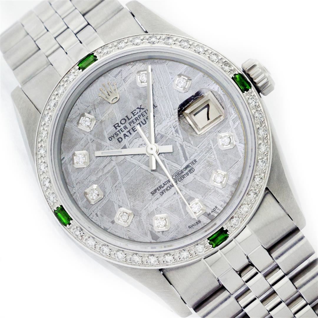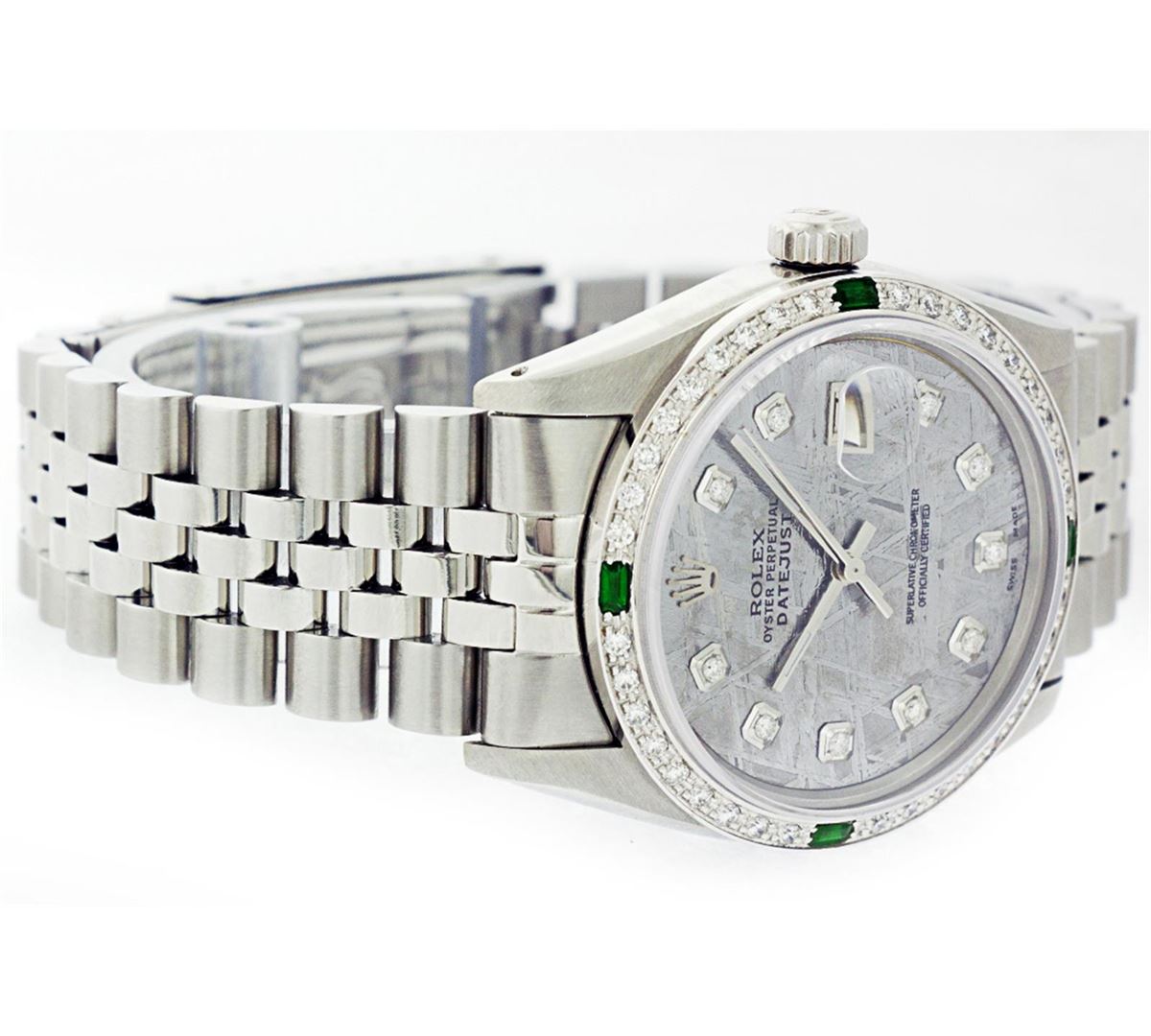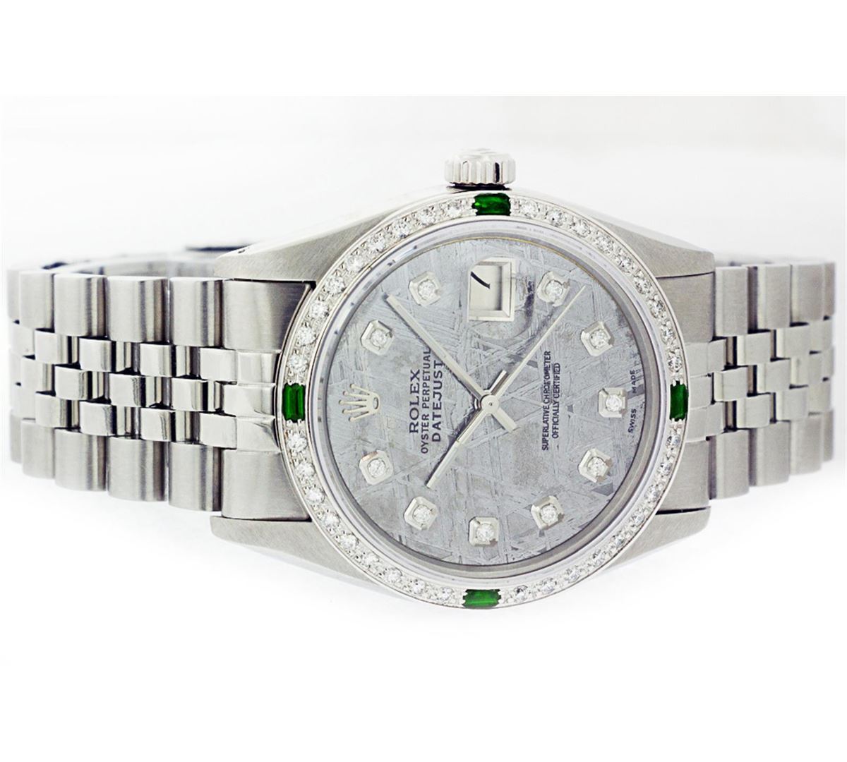 One Mens Stainless Steel Rolex Datejust Polished Bright with Satin Finish, Fully Serviced & Electronically Tested, Stainless Steel Case:36mm, Stainless Steel Crown, Custom Bezel: 18K White Gold Emerald Beadset Diamond Bezel, Diamond Count: 36 Diamonds + 4 Emeralds, Total Weight 1.00 Carat, Clarity: SI-VS, Color: G to H. Custom Crystal: Synthetic Sapphire Cyclops Lens. Movement: Automatic Winding Movement Caliber 3035. Custom Dial: Meteorite Diamond Dial, 10 Diamonds in Dial, G To H In Color, Clarity: SI-VS. Date Window: 3 O'Clock Position Date Display, Quickset, Model: Datejust, Condition: G-6 Extra Fine. Bracelet:Stainless Steel Jubilee. Bright Polish & Satin Finish. 6.5 Inch Length, Adjustable. Standard Clasp, With Rolex Logo.
