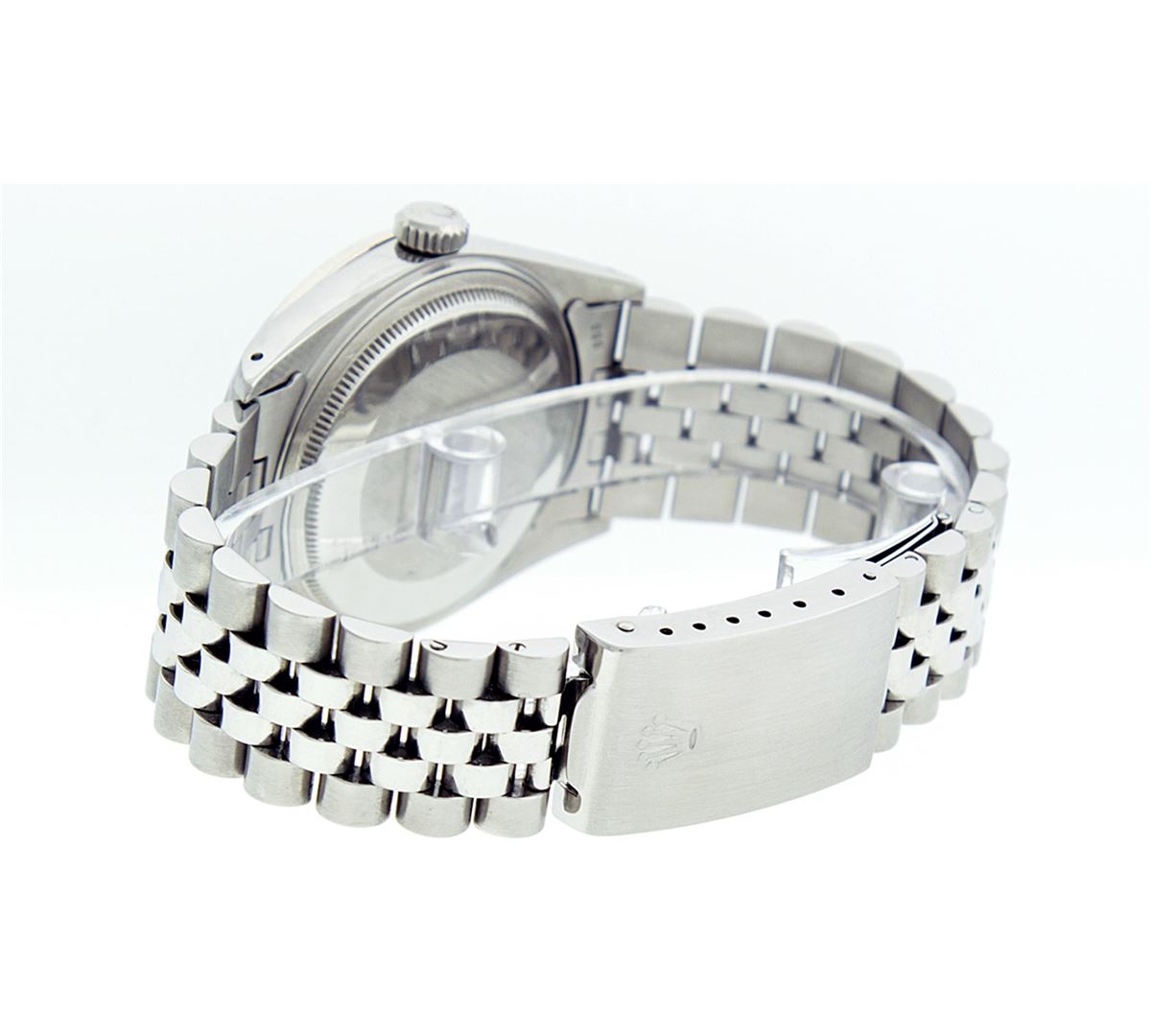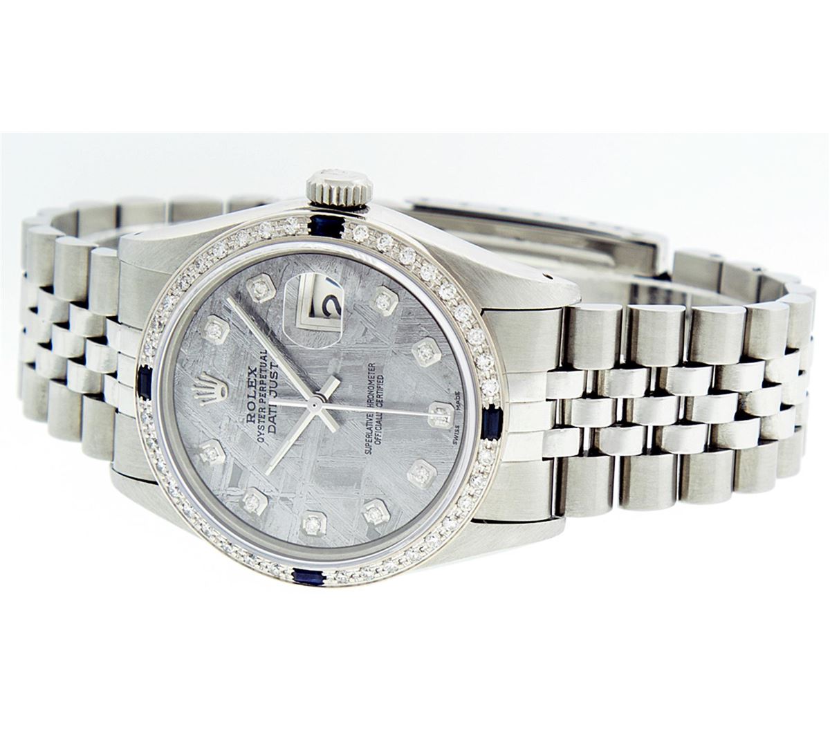 One Mens Stainless Steel Rolex Datejust Polished Bright with Satin Finish, Fully Serviced & Electronically Tested, Stainless Steel Case:36mm, Stainless Steel Crown, Custom Bezel: 18K White Gold Sapphire Beadset Diamond Bezel, Diamond Count: 36 Diamonds + 4 Sapphire, Total Weight 1.00 Carat, Clarity: SI-VS, Color: G to H. Custom Crystal: Synthetic Sapphire Cyclops Lens. Movement: Automatic Winding Movement Caliber 3035. Custom Dial: Meteorite Diamond Dial, 10 Diamonds in Dial, G To H In Color, Clarity: SI-VS. Date Window: 3 O'Clock Position Date Display, Quickset, Model: Datejust, Condition: G-6 Extra Fine. Bracelet:Stainless Steel Jubilee. Bright Polish & Satin Finish. 7.0 Inch Length, Adjustable. Standard Clasp, With Rolex Logo.
