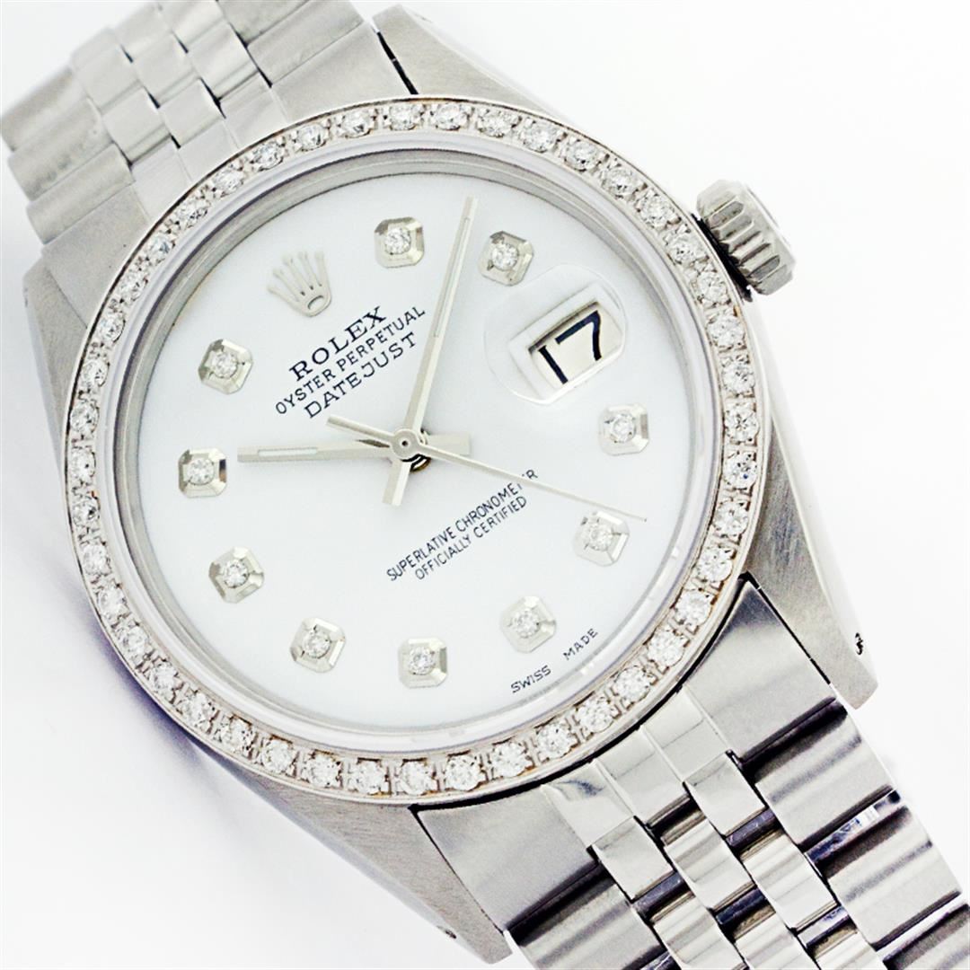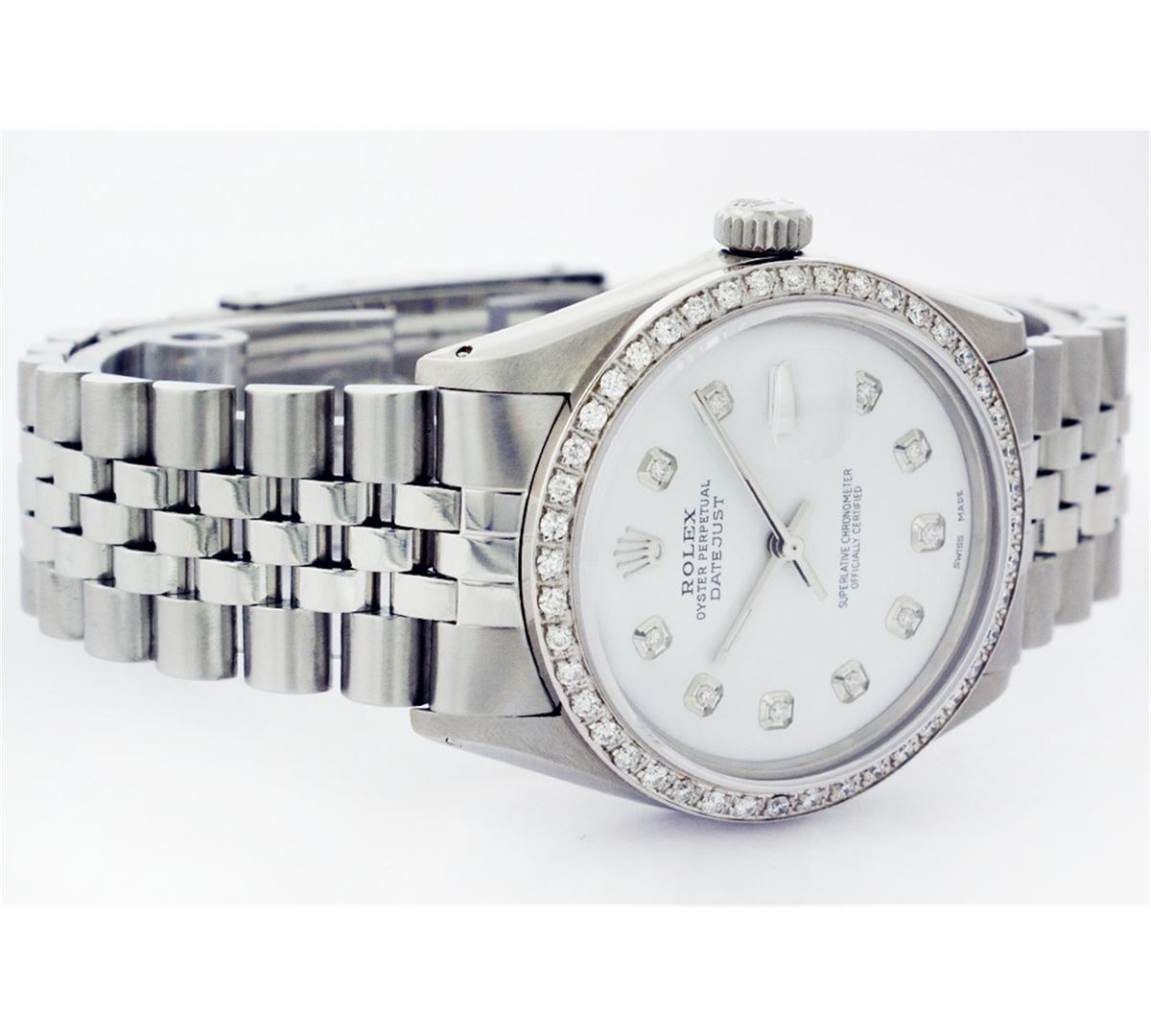 One Mens Stainless Steel Rolex Datejust Polished Bright with Satin Finish, Fully Serviced & Electronically Tested, Stainless Steel Case:36mm, Stainless Steel Crown, Custom Bezel: 18K White Gold Beadset Diamond Bezel, Diamond Count: 44 Diamonds Total Weight 1.00 Carat, Clarity: SI-VS, Color: G to H. Custom Crystal: Synthetic Sapphire Cyclops Lens. Movement: Automatic Winding Movement Caliber 3035. Custom Dial: Mother Of Pearl With Diamond Hour Markers, 10 Diamonds in Dial G To H In Color, Clarity: SI-VS. Date Window: 3 O'Clock Position Date Display, Quickset, Model: Datejust, Condition: G-6 Extra Fine. Bracelet:Stainless Steel Jubilee. Bright Polish & Satin Finish. 6.5 Inch Length, Adjustable. Standard Clasp, With Rolex Logo.