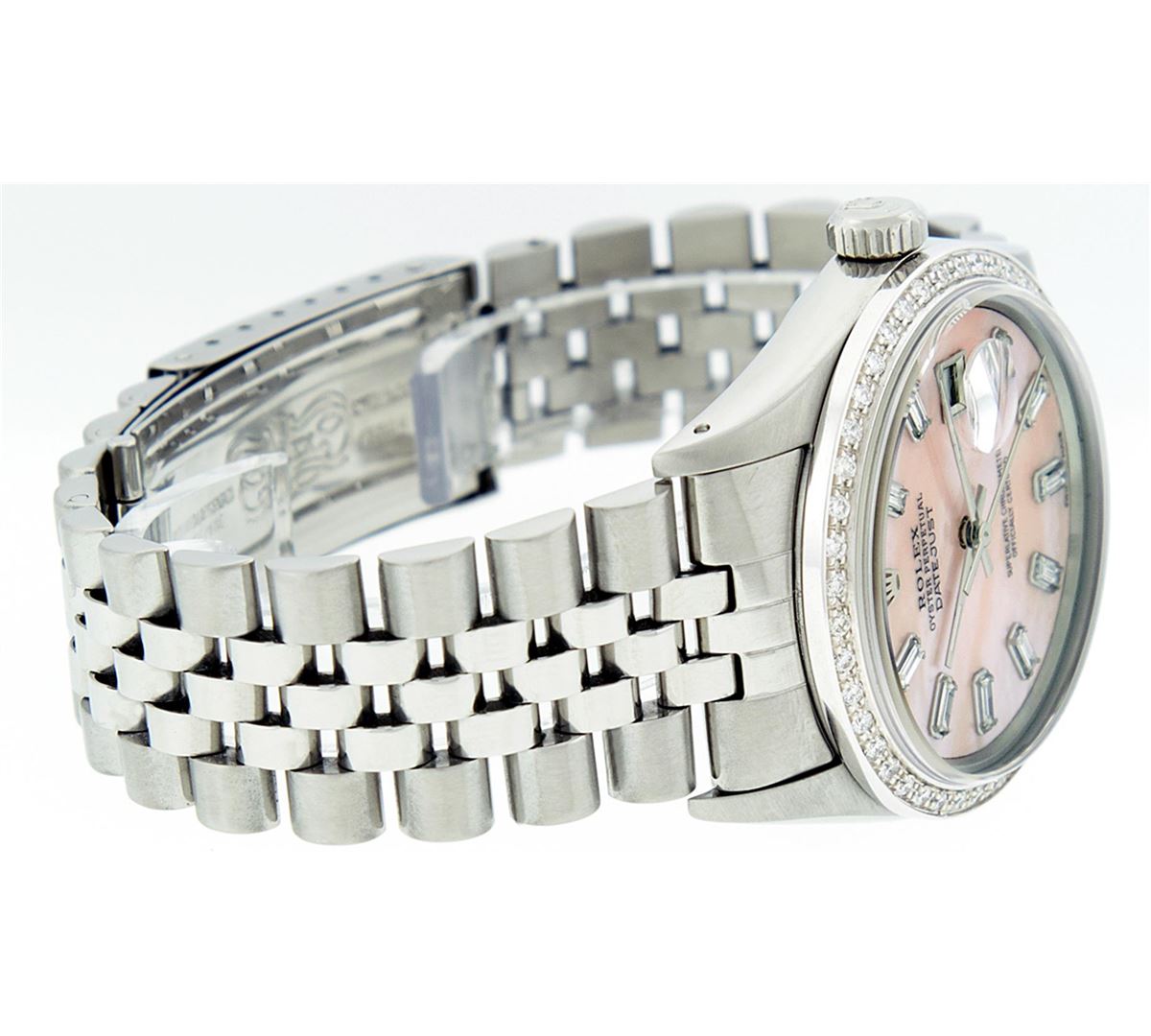 One Mens Rolex Datejust Polished, Serviced & Electronically Tested, Stainless Steel Case:36mm, Stainless Steel Crown, Custom Bezel: 18K White Gold Beadset Diamond Bezel, Diamond Count: 44 Diamonds, Total Weight 1.00 Carat, Clarity: SI-VS, Color: G to H. Custom Crystal: Synthetic Sapphire Cyclops Lens. Movement: Automatic Winding Movement Caliber 3035. Custom Dial: Pink MOP Baguette Diamond Hour Markers, Diamond Count: 10 Diamond Baguette. G To H In Color, Clarity: SI-VS. Date Window: 3 O'Clock Position Date Display, Quickset, Model: Datejust. Condition: G-6 Extra Fine. Bracelet: Stainless Steel Jubilee. Bright Polish & Satin Finish. 7.0 Inch Length, Adjustable. Standard Clasp, With Rolex Logo
