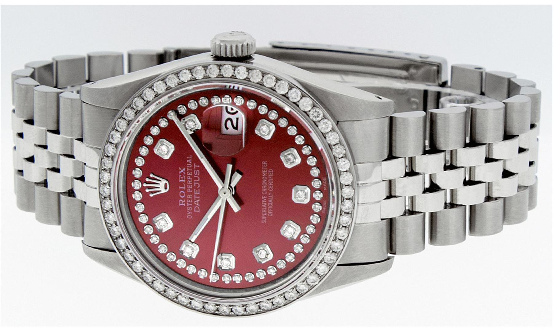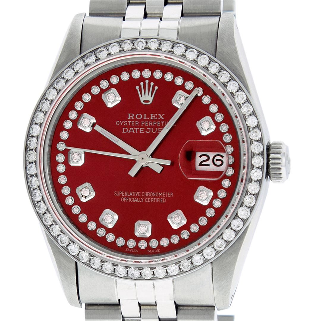 One Mens Rolex Datejust Polished Bright with Satin Finish, Serviced & Electronically Tested, Stainless Steel Case:36mm, Stainless Steel Crown, Custom Bezel: Stainless Steel Beadset Diamond Bezel, Diamond Count: 54 Diamonds Total Weight 1.00 Carat, Clarity: SI-VS, Color: G to H. Custom Crystal: Synthetic Sapphire Cyclops Lens. Movement: Automatic Winding Movement Caliber 3035. Custom Dial: Red String Diamond Dial, Diamond Count: 58 Diamonds In Dial, Color: G to H, Clarity: VS2-SI1. Date Window: 3 O'Clock Position Date Display, Quickset, Model: Datejust. Condition: G-6 Extra Fine. Bracelet:Stainless Steel Jubilee. Bright Polish & Satin Finish. 7.0 Inch Length, Adjustable. Standard Clasp, With Rolex Logo. This watch has been serviced time tested and is in excellent condition it is free of all scratches and dents.