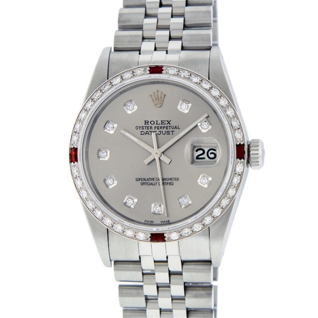 One Mens Rolex Datejust Polished Bright with Satin Finish, Serviced & Electronically Tested, Stainless Steel Case:36mm, 14K Stainless Steel Crown, Custom Bezel: 18K White Gold Ruby Beadset Diamond Bezel, Diamond + Gem Count: 36 Diamonds + 4 Rubys Total Weight 1.00 Carat, Clarity: Si-VS, Color: G to H. Custom Crystal: Synthetic Sapphire Cyclops Lens. Movement: Automatic Winding Movement Caliber 3035. Custom Dial: Slate Grey Dial Set With Diamond Hour Markers, 10 Diamond in Dial G To H In Color, Si-VS Clarity. Date Window: 3 O'Clock Position Date Display, Quickset, Model: Datejust. Condition: G-6 Extra Fine. Bracelet:Stainless Steel Jubilee. Bright Polish & Satin Finish. 7.0 Inch Length, Adjustable. Standard Clasp, With Rolex Logo.