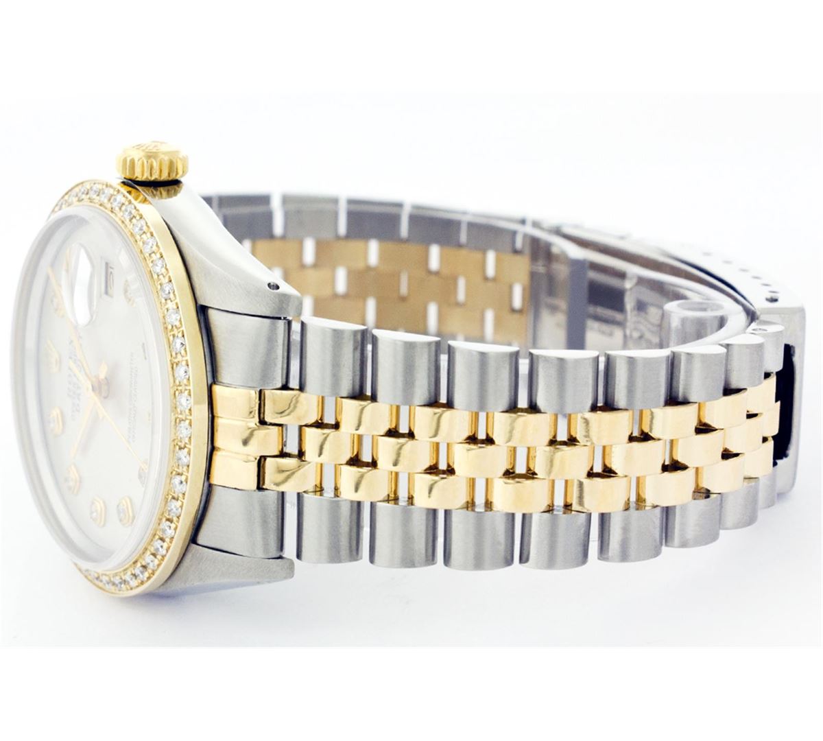 One Mens Two Tone Rolex Datejust Polished, Fully Serviced & Electronically Tested, 14K Yellow Gold & Stainless Steel Case:36mm, 14K Yellow Gold Crown, Custom Aftermarket Bezel: 18K Yellow Gold Beadset Diamond Bezel, Diamond Count: 44 Diamonds, Total Weight 1.0 Carat, Clarity: Si-VS, Color: G to H. Custom Aftermarket Crystal: Synthetic Sapphire Cyclops Lens. Movement: Automatic Winding Movement Caliber 3035. Custom Aftermarket Dial: Silver Diamond Dial, Diamond Count: 10 Diamonds In Dial, Clarity: SI-VS, Color: G to H. Date Window: 3 O'Clock Position Date Display, Quickset, Model: Datejust Condition: G-6 Extra Fine. Bracelet: Two Tone 14K Yellow Gold & Stainless Steel Jubilee. Bright Polish. 6.5 Inch Length, Adjustable. Standard Clasp, With Rolex Logo.