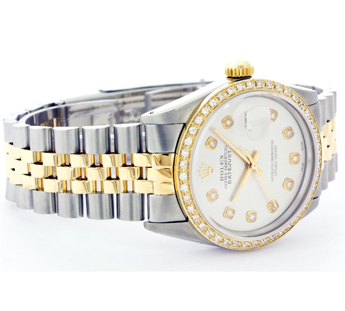 One Mens Two Tone Rolex Datejust Polished, Fully Serviced & Electronically Tested, 14K Yellow Gold & Stainless Steel Case:36mm, 14K Yellow Gold Crown, Custom Bezel: 18K Yellow Gold Beadset Diamond Bezel, Diamond Count: 44 Diamonds, Total Weight 1.0 Carat, Clarity: Si-VS, Color: G to H. Custom Crystal: Synthetic Sapphire Cyclops Lens. Movement: Automatic Winding Movement Caliber 3035. Custom Dial: Silver Diamond Dial, Diamond Count: 10 Diamonds In Dial, Clarity: SI-VS, Color: G to H. Date Window: 3 O'Clock Position Date Display, Quickset, Model: Datejust Condition: G-6 Extra Fine. Bracelet: Two Tone 14K Yellow Gold & Stainless Steel Jubilee. Bright Polish. 6.5 Inch Length, Adjustable. Standard Clasp, With Rolex Logo.