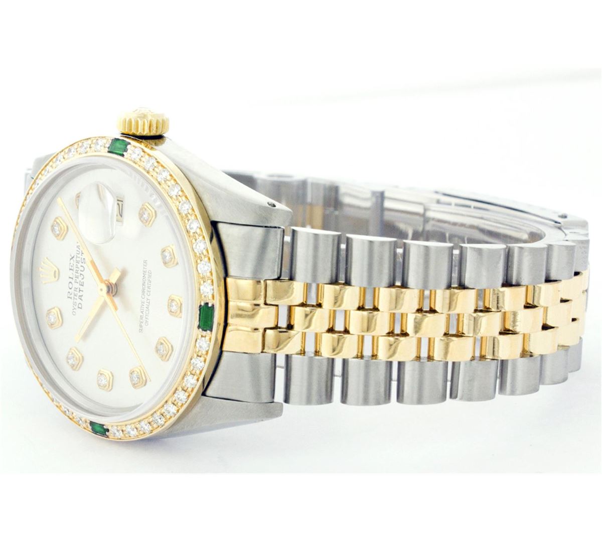 One Mens Two Tone Rolex Datejust Polished, Fully Serviced & Electronically Tested, 14K Yellow Gold & Stainless Steel Case:36mm, 14K Yellow Gold Crown, Custom Aftermarket Bezel: 18K Yellow Gold Emerald Beadset Diamond Bezel, Diamond Count: 36 Diamonds + 4 Emeralds, Total Weight 1.0 Carat, Clarity: Si-VS, Color: G to H. Custom Aftermarket Crystal: Synthetic Sapphire Cyclops Lens. Movement: Automatic Winding Movement Caliber 3035. Custom Aftermarket Dial: Silver Diamond Dial, Diamond Count: 10 Diamonds In Dial, Color: G to H, Clarity: SI -VS. Date Window: 3 O'Clock Position Date Display, Quickset, Model: Datejust Condition: G-6 Extra Fine. Bracelet: Two Tone 14K Yellow Gold & Stainless Steel Jubilee. Bright Polish. 6.5 Inch Length, Adjustable. Standard Clasp, With Rolex Logo.
