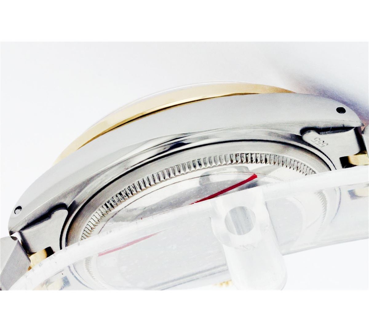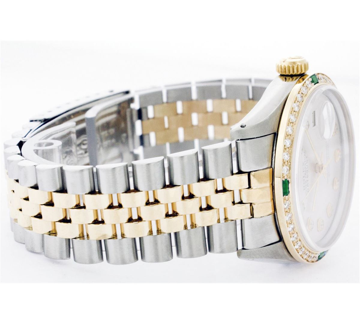 One Mens Two Tone Rolex Datejust Polished, Fully Serviced & Electronically Tested, 14K Yellow Gold & Stainless Steel Case:36mm, 14K Yellow Gold Crown, Custom Bezel: 18K Yellow Gold Emerald Beadset Diamond Bezel, Diamond Count: 36 Diamonds + 4 Emeralds, Total Weight 1.0 Carat, Clarity: Si-VS, Color: G to H. Custom Crystal: Synthetic Sapphire Cyclops Lens. Movement: Automatic Winding Movement Caliber 3035. Custom Dial: Silver Diamond Dial, Diamond Count: 10 Diamonds In Dial, Color: G to H, Clarity: SI -VS. Date Window: 3 O'Clock Position Date Display, Quickset, Model: Datejust Condition: G-6 Extra Fine. Bracelet: Two Tone 14K Yellow Gold & Stainless Steel Jubilee. Bright Polish. 6.5 Inch Length, Adjustable. Standard Clasp, With Rolex Logo.