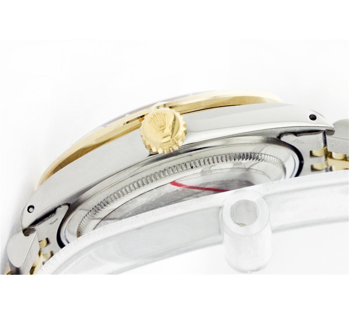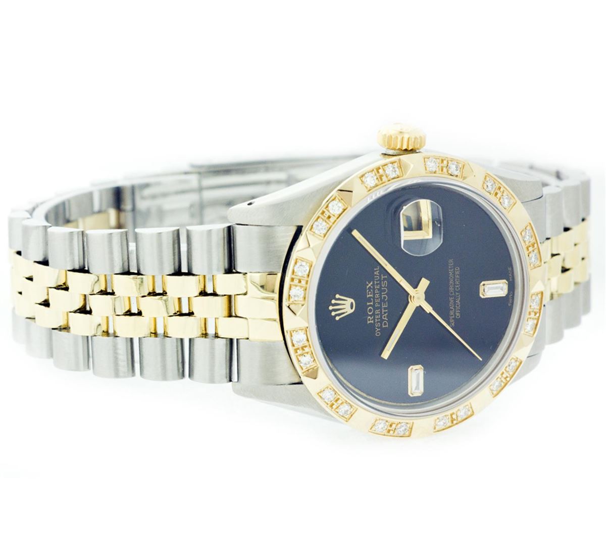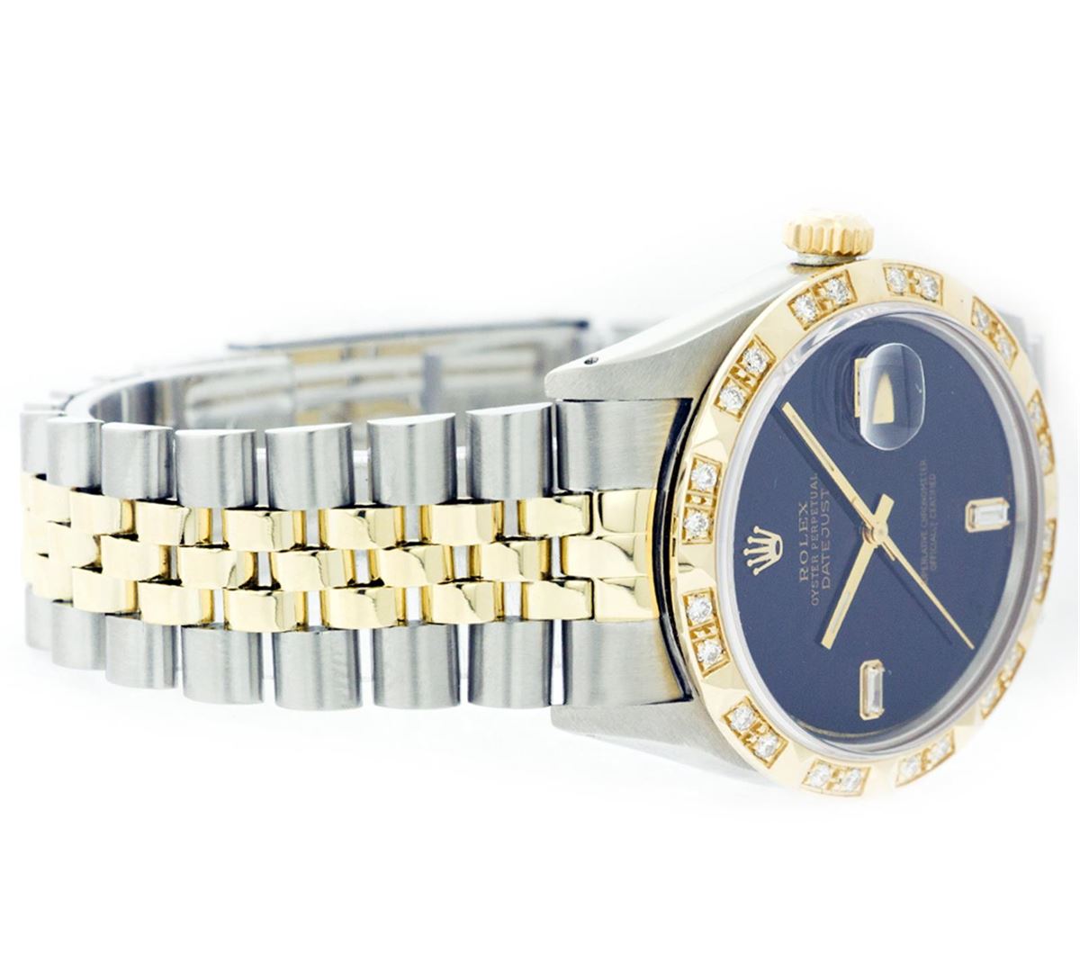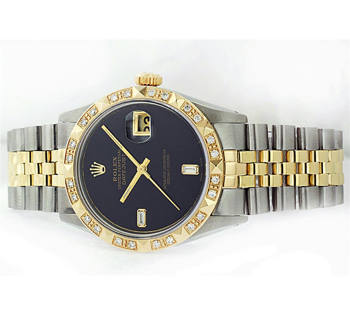 One Mens Two Tone Rolex Datejust Polished, Fully Serviced & Electronically Tested, 14K Yellow Gold & Stainless Steel Case:36mm, 14K Yellow Gold Crown, Custom Bezel: 18K Yellow Gold Pyramid Diamond Bezel, Diamond Count: 24 Diamonds, Total Weight .75 Carat, Clarity: Si-VS, Color: G to H. Custom Crystal: Synthetic Sapphire Cyclops Lens. Movement: Automatic Winding Movement Caliber 3035. Custom Dial: Black Onyx Baguette Diamond Dial, Diamond Count: 2 Baguette Diamonds In Dial, Color: G to H, Clarity: SI -VS. Date Window: 3 O'Clock Position Date Display, Quickset, Model: Datejust Condition: G-6 Extra Fine. Bracelet: Two Tone 14K Yellow Gold & Stainless Steel Jubilee. Bright Polish. 6.5 Inch Length, Adjustable. Standard Clasp, With Rolex Logo.