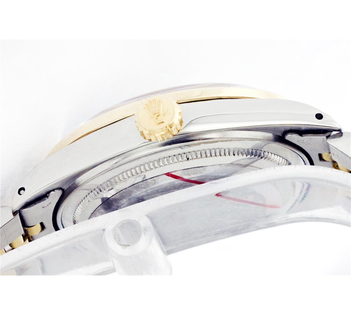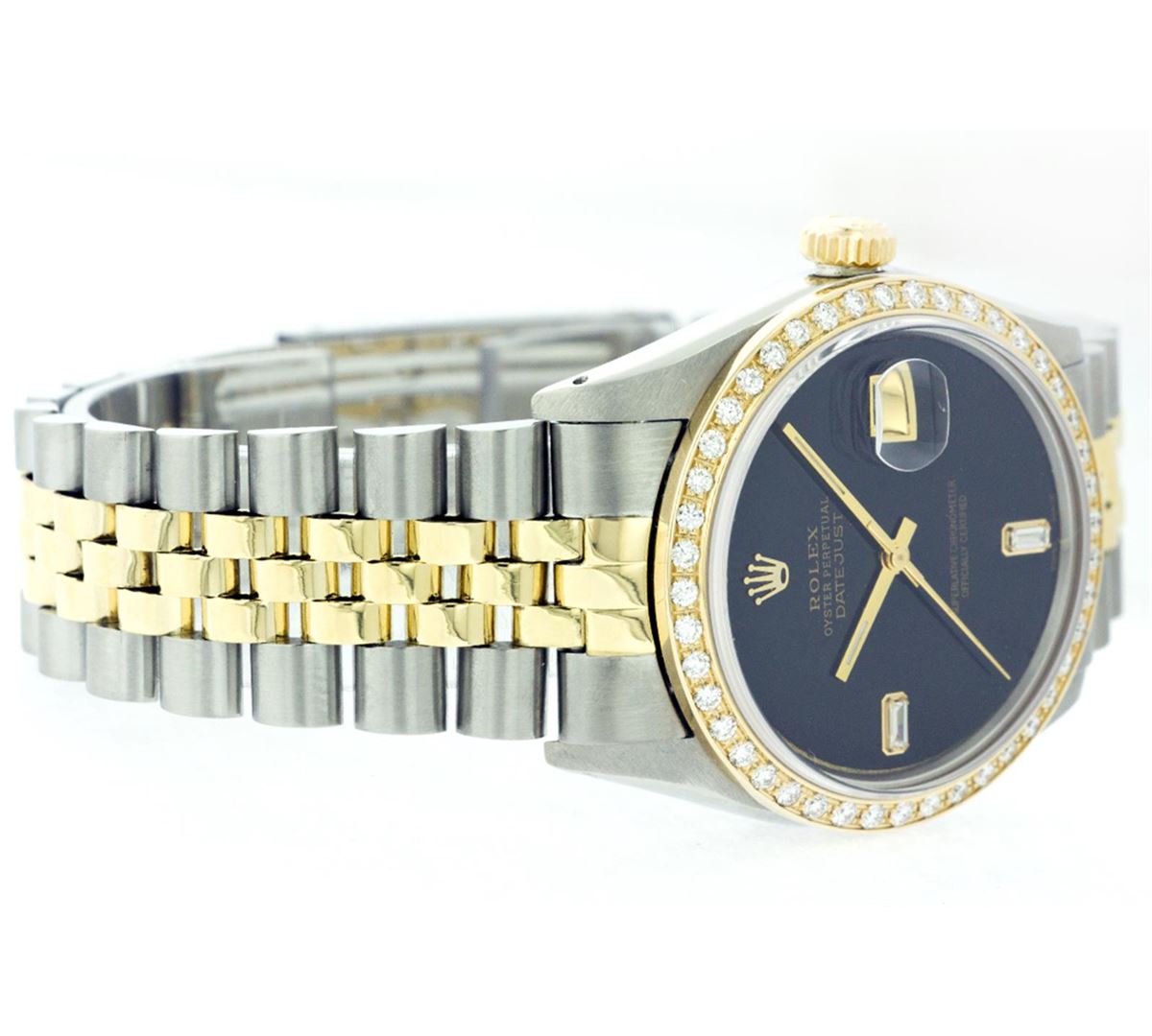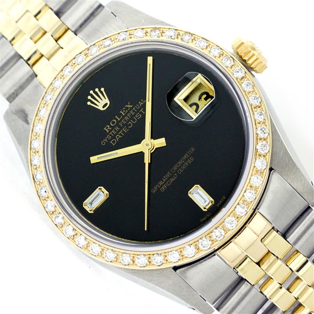 One Mens Two Tone Rolex Datejust Polished, Fully Serviced & Electronically Tested, 14K Yellow Gold & Stainless Steel Case:36mm, 14K Yellow Gold Crown, Custom Bezel: 18K Yellow Gold Beadset Diamond Bezel, Diamond Count: 44 Diamonds, Total Weight 1.00 Carat, Clarity: Si-VS, Color: G to H. Custom Crystal: Synthetic Sapphire Cyclops Lens. Movement: Automatic Winding Movement Caliber 3035. Custom Dial: Black Onyx Baguette Diamond Dial, Diamond Count: 2 Baguette Diamonds In Dial, Color: G to H, Clarity: SI -VS. Date Window: 3 O'Clock Position Date Display, Quickset, Model: Datejust Condition: G-6 Extra Fine. Bracelet: Two Tone 14K Yellow Gold & Stainless Steel Jubilee. Bright Polish. 6.5 Inch Length, Adjustable. Standard Clasp, With Rolex Logo.