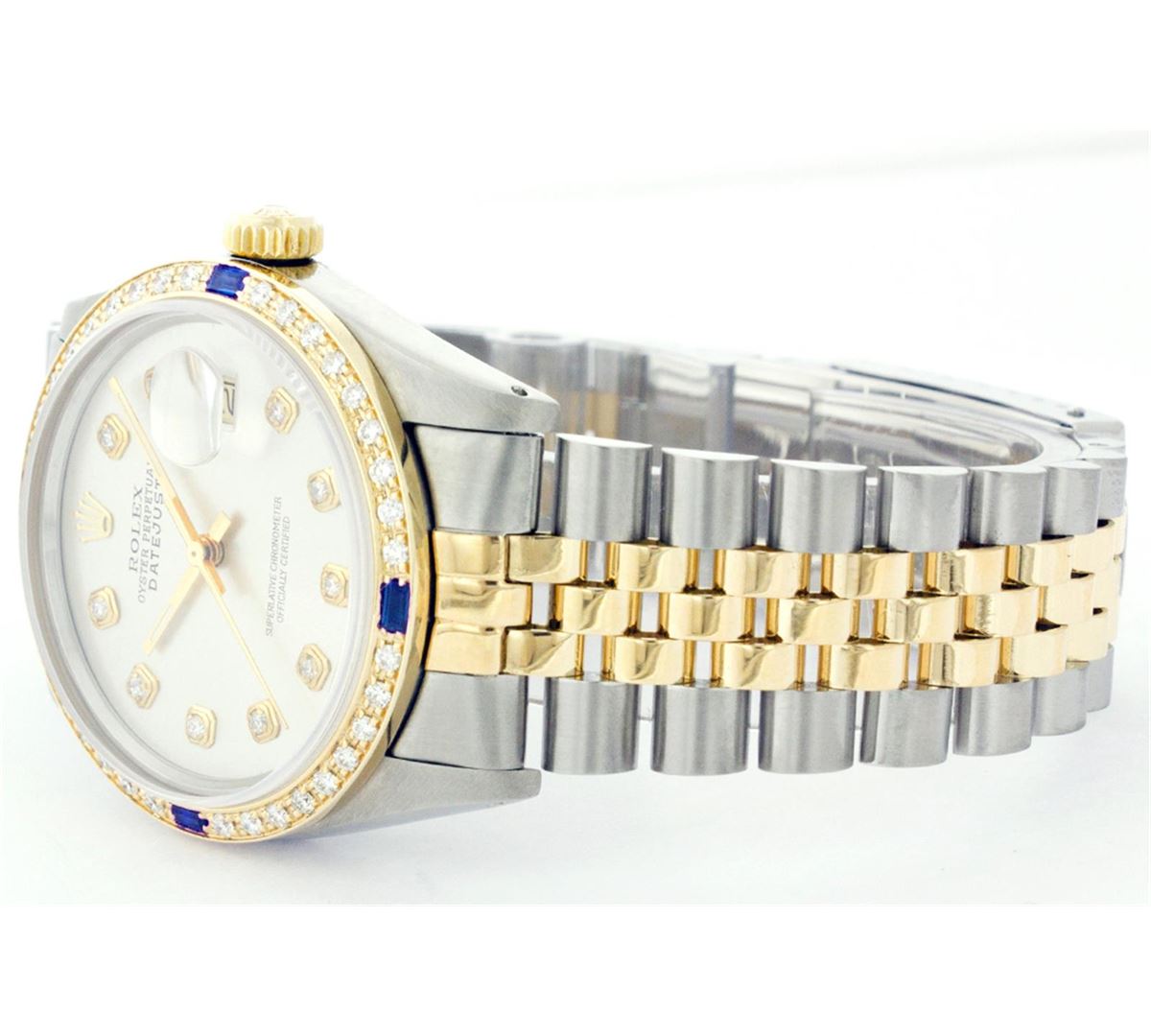 One Mens Two Tone Rolex Datejust Polished, Fully Serviced & Electronically Tested, 14K Yellow Gold & Stainless Steel Case:36mm, 14K Yellow Gold Crown, Custom Bezel: 18K Yellow Gold Sapphire Beadset Diamond Bezel, Diamond Count: 36 Diamonds + 4 Sapphires, Total Weight 1.0 Carat, Clarity: Si-VS, Color: G to H. Custom Crystal: Synthetic Sapphire Cyclops Lens. Movement: Automatic Winding Movement Caliber 3035. Custom Dial: Silver Diamond Dial, Diamond Count: 10 Diamonds In Dial, Color: G to H, Clarity: SI-VS. Date Window: 3 O'Clock Position Date Display, Quickset, Model: Datejust Condition: G-6 Extra Fine. Bracelet: Two Tone 14K Yellow Gold & Stainless Steel Jubilee. Bright Polish. 6.5 Inch Length, Adjustable. Standard Clasp, With Rolex Logo.